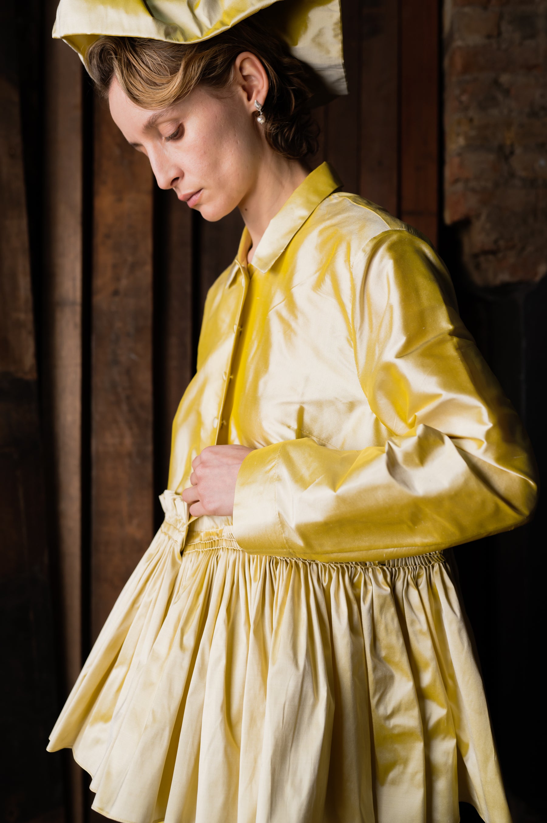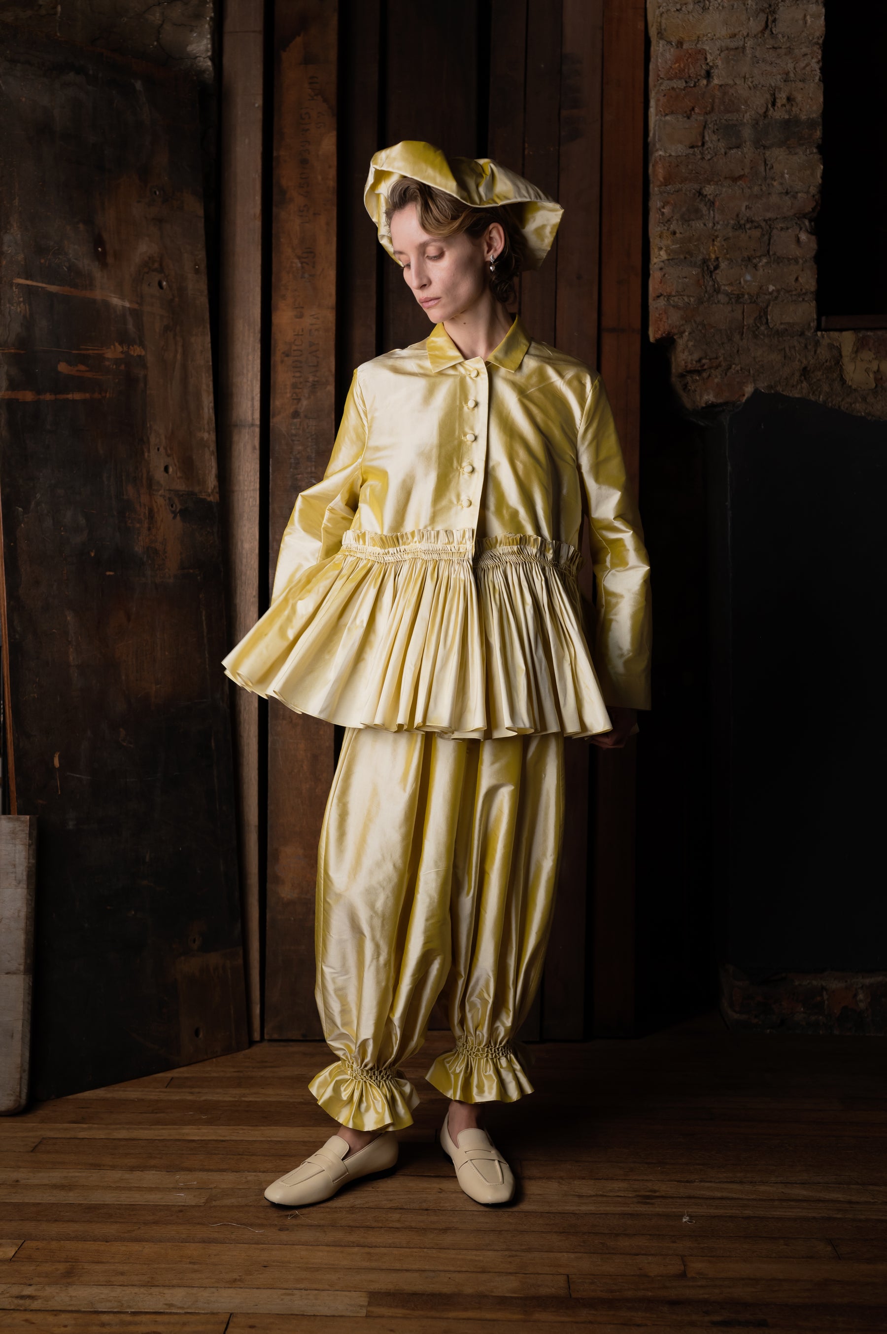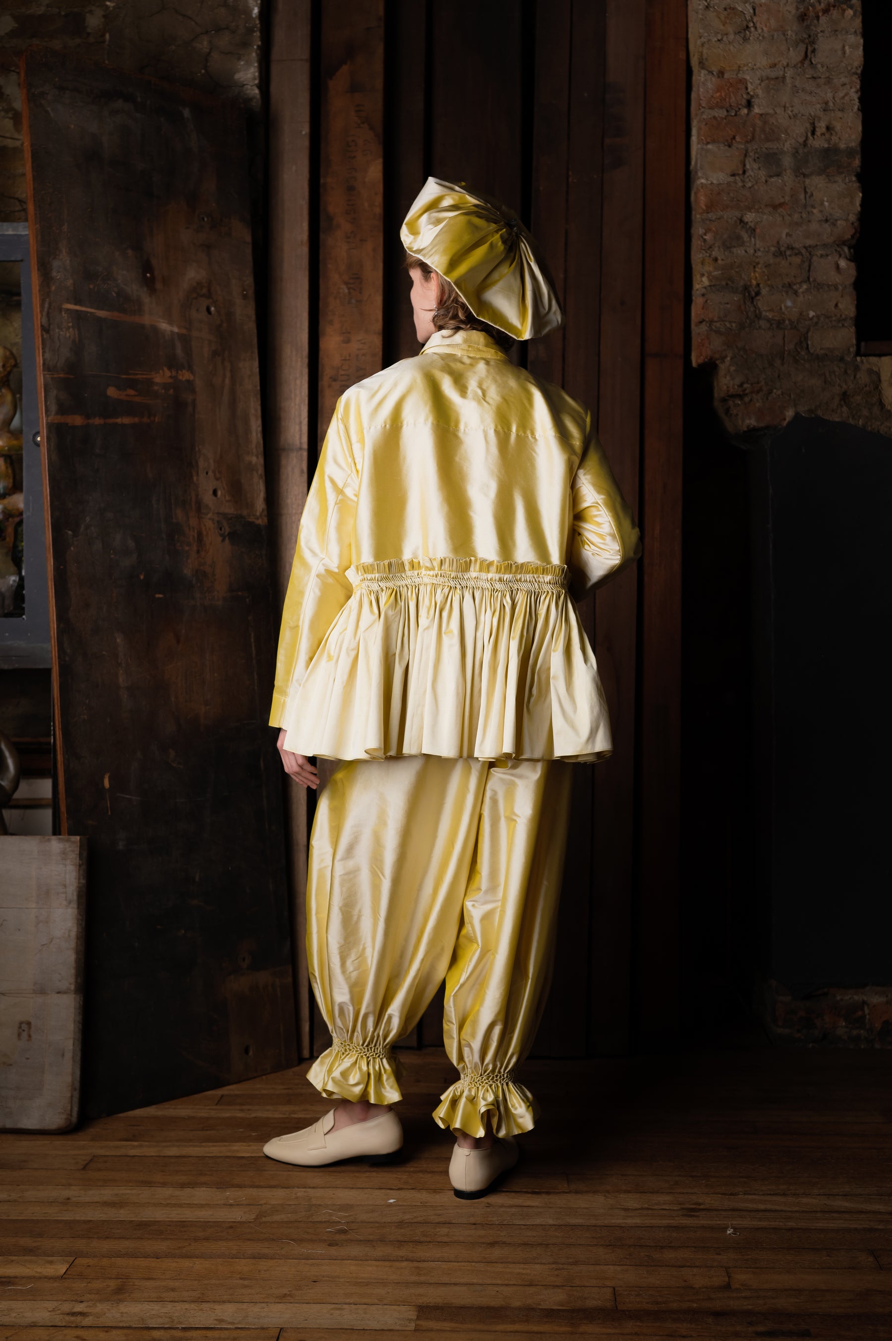 The Bridal Smocked Jacket is a classic fitted jacket with a full, Cawley-signature smocked skirt. In a smooth silk dupion woven in India and matching silk-covered buttons. With over seven meters of hand-gathered and hand-smocked silk to create the fullness of the skirt, the Bridal Smocked Jacket is our most time-intensive piece, making it a truly special addition to your wedding. The jacket pairs perfectly with the Bridal Smocked Trouser, creating a beautiful wedding suit.