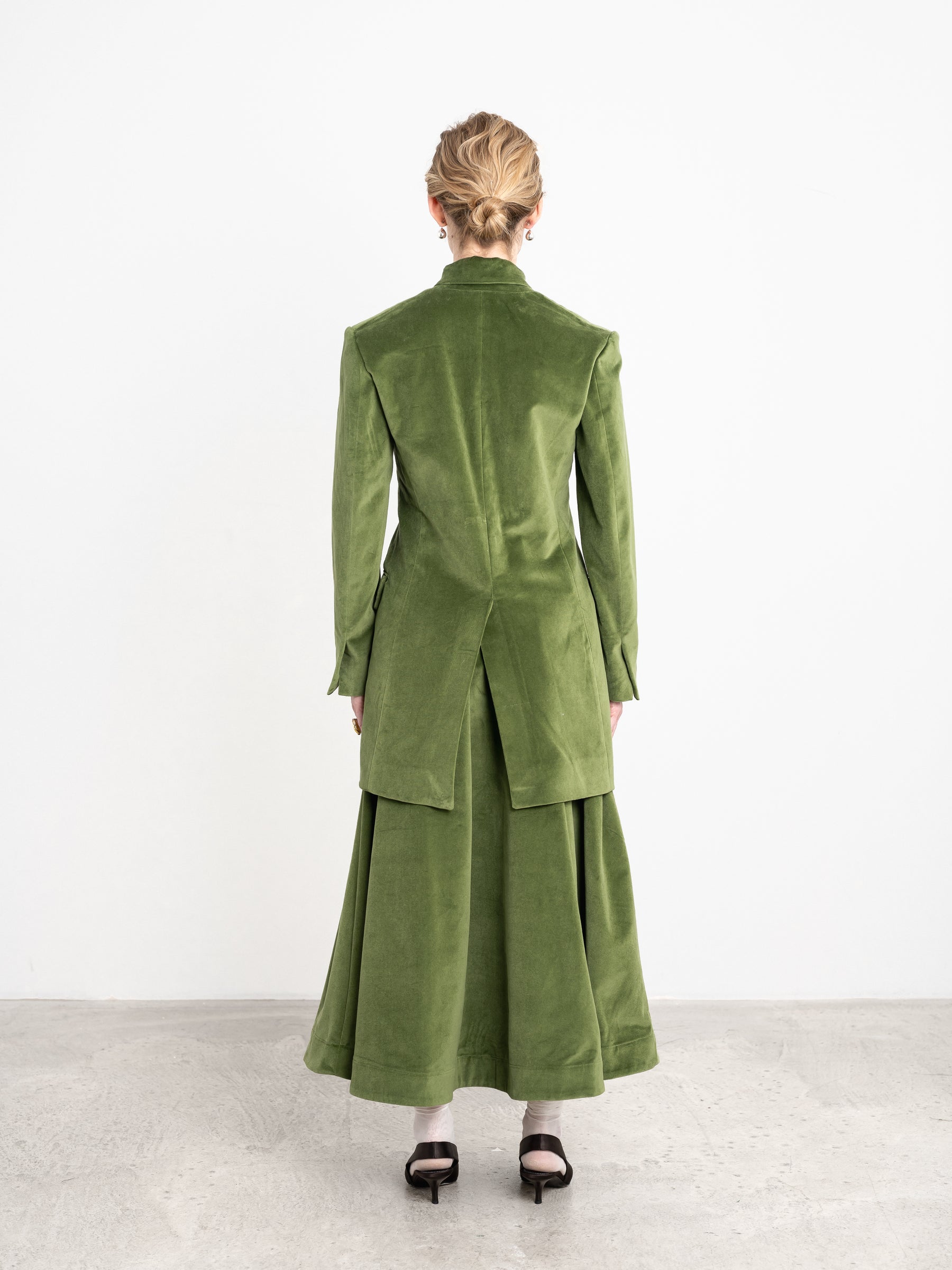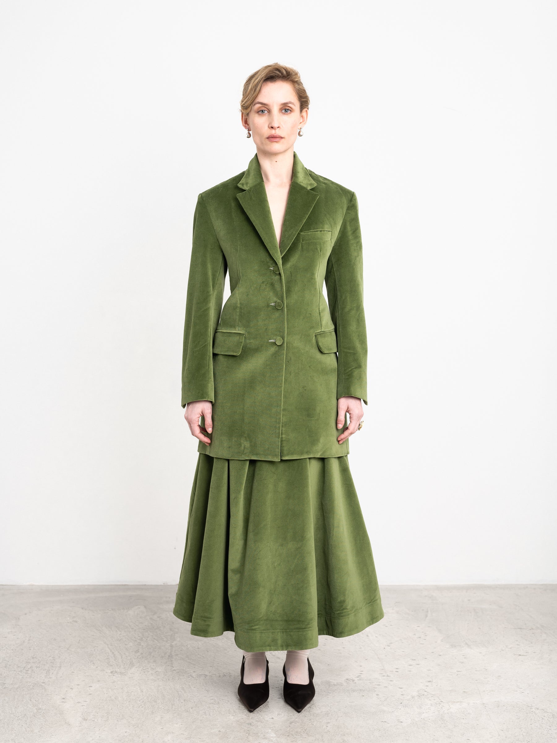 DEFINED BY ITS SHARP LINES AND CRISP SILHOUETTE, THE ELODIE BLAZER IS A SINGLE-BREASTED LONGLINE JACKET. CUT FROM SMOOTH BRITISH COTTON VELVET, FRAMED WITH PADDED SHOULDERS AND PEAKED LAPELS AND DARTS AT THE FRONT TO CREATE A SOPHISTICATED SHAPE. THE JACKET IS FINISHED WITH MATCHING VELVET COVERED BUTTONS