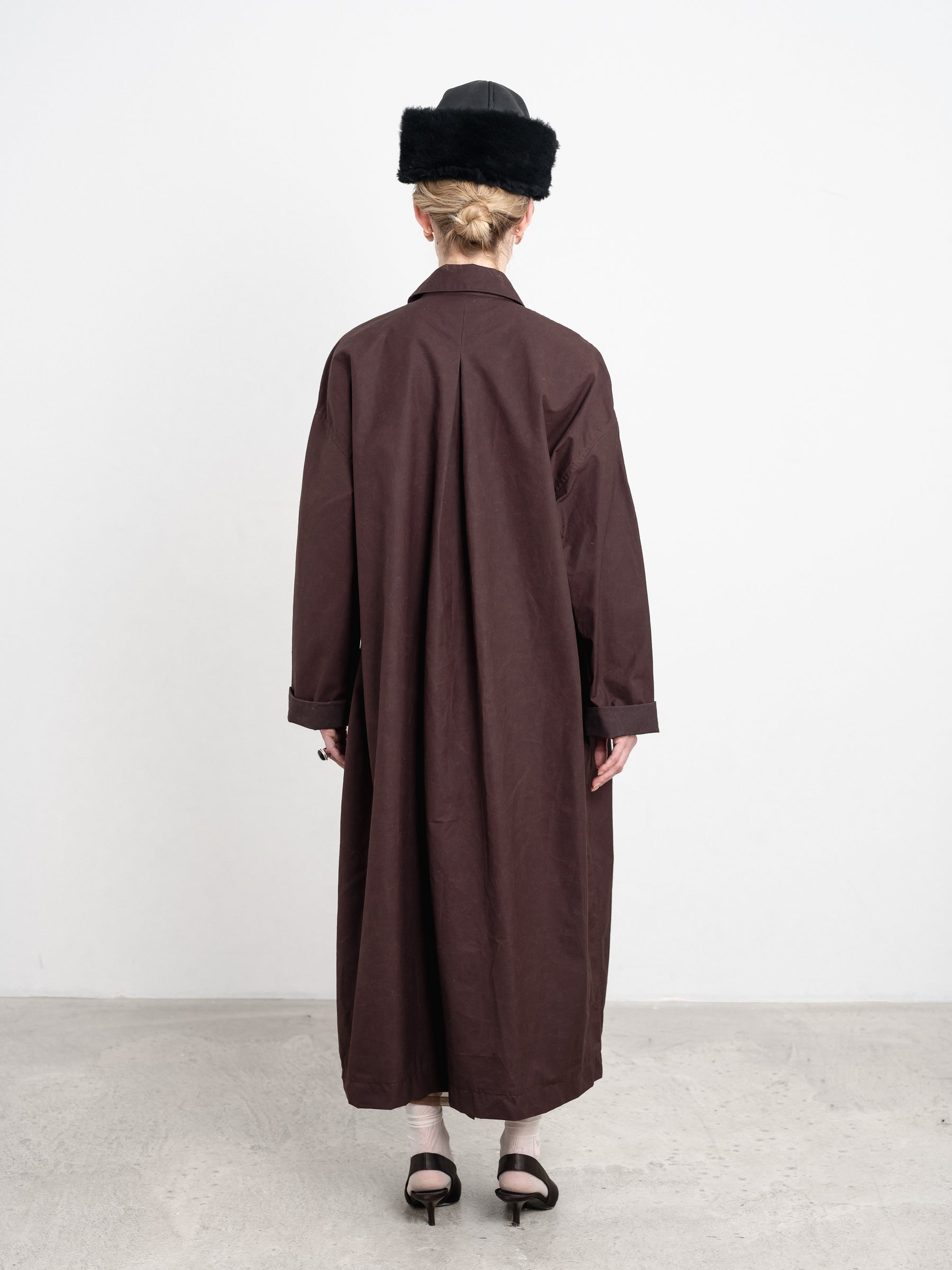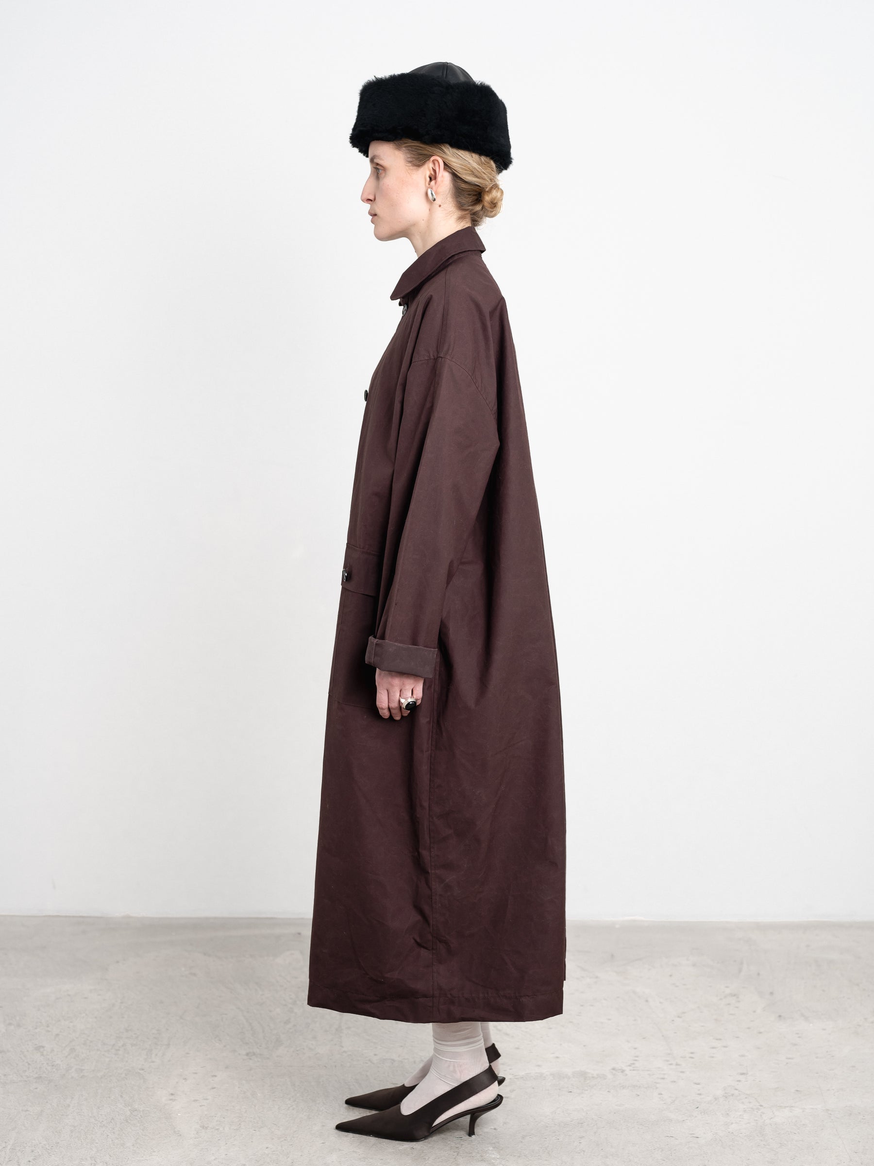 THE ARLO MAC IN DARK MULBERRY IS A CLASSIC OVERSIZED COAT CUT FROM SHOWER-RESISTANT BRITISH DRY OILSKIN. THE MAC FEATURES A HORN-BUTTON FASTENING, TWO FRONT PATCH POCKETS WITH PLEATS, POINTED COLLAR AND BACK INVERTED PLEAT.
