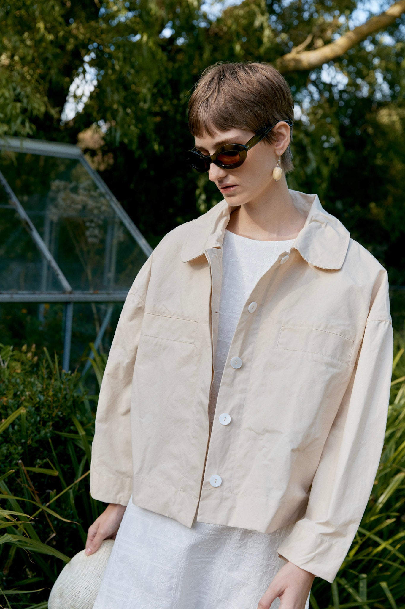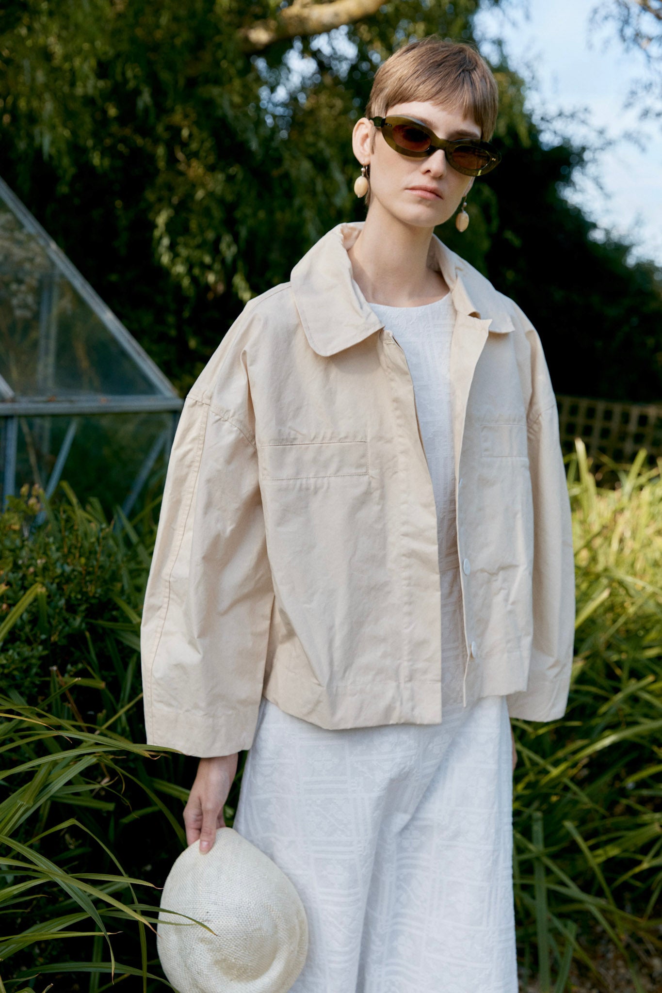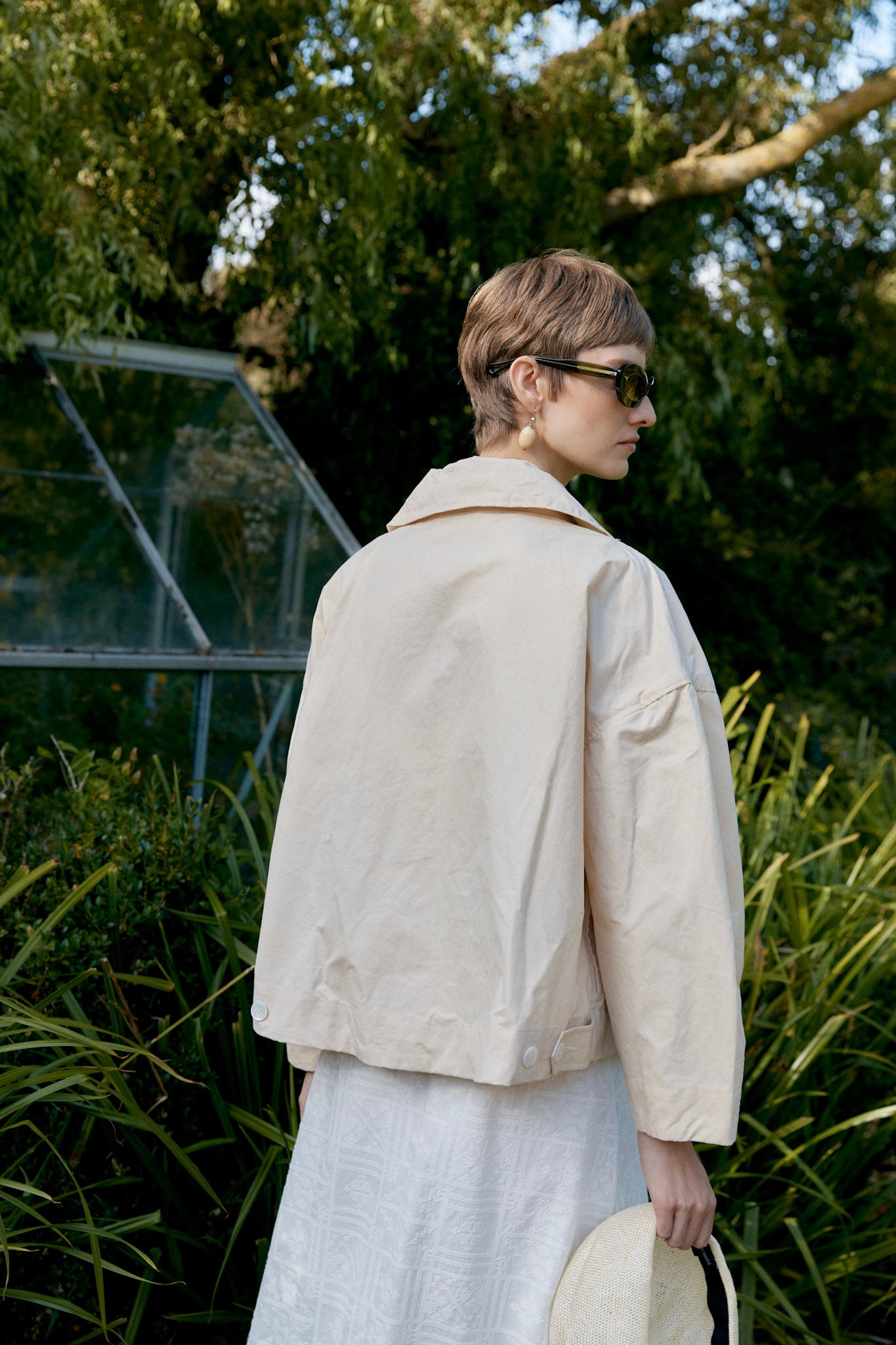 The Wesley Jacket crafted from a showerproof British Dry Oilskin is a refined take on utility. Meticulously cut to have an oversized and boxy silhouette, the jacket features chest welt pockets, a concealed button placket and exaggerated rounded collar. Workwear-inspired touches include buttoned waist tabs to create more defined volume and practical side seam pockets finish the garment.