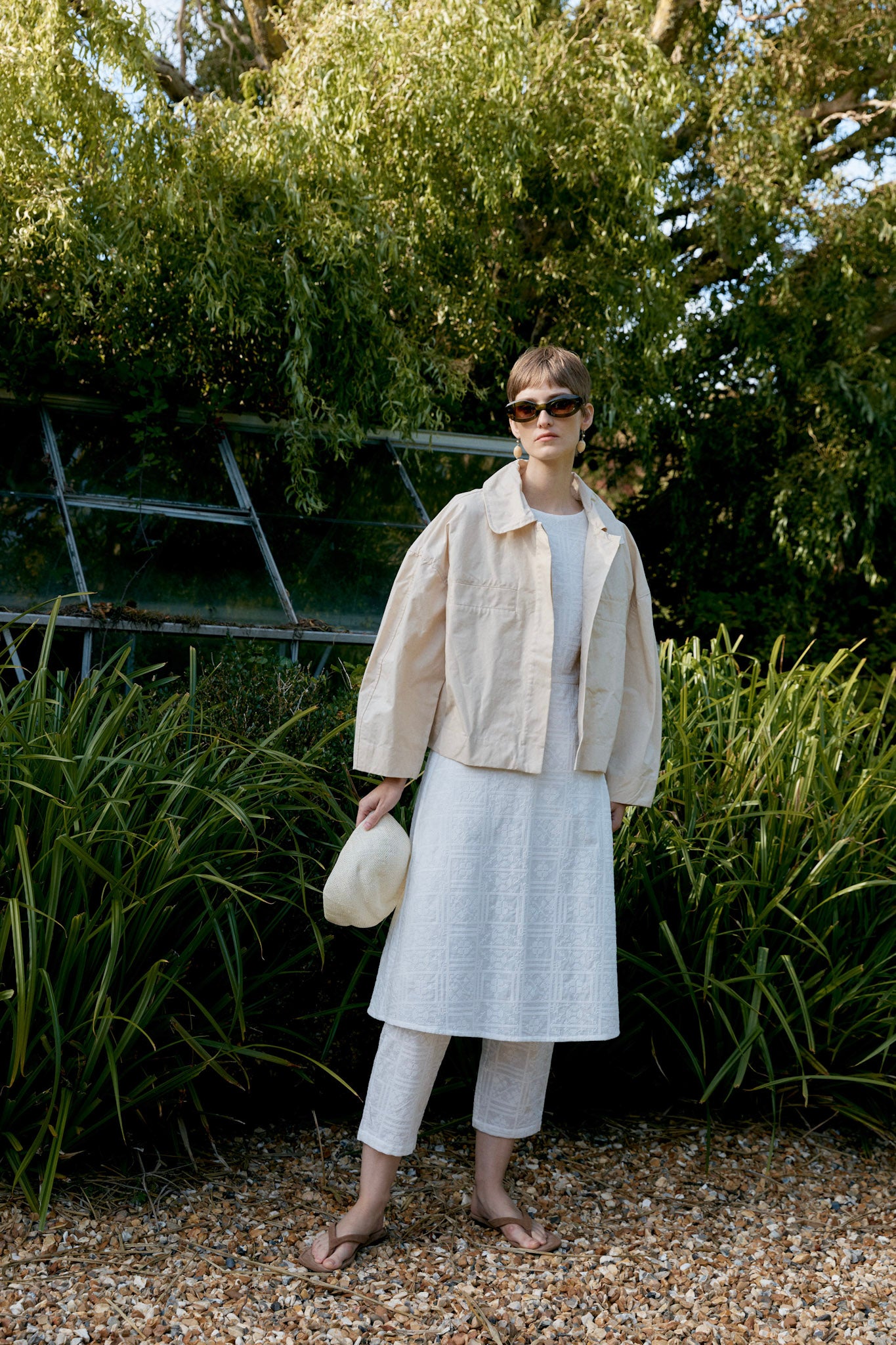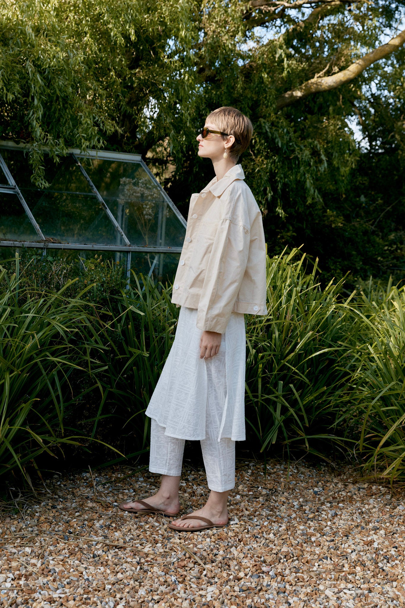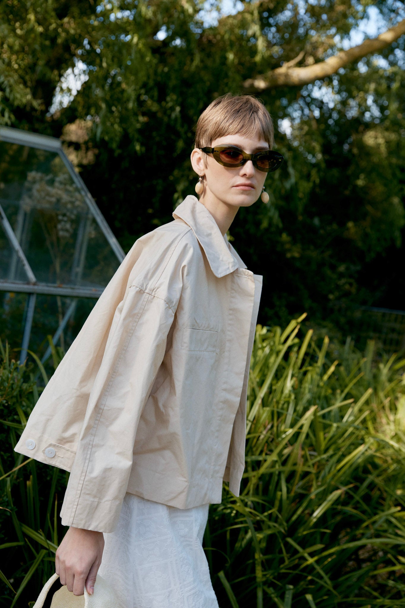 The Wesley Jacket crafted from a showerproof British Dry Oilskin is a refined take on utility. Meticulously cut to have an oversized and boxy silhouette, the jacket features chest welt pockets, a concealed button placket and exaggerated rounded collar. Workwear-inspired touches include buttoned waist tabs to create more defined volume and practical side seam pockets finish the garment.