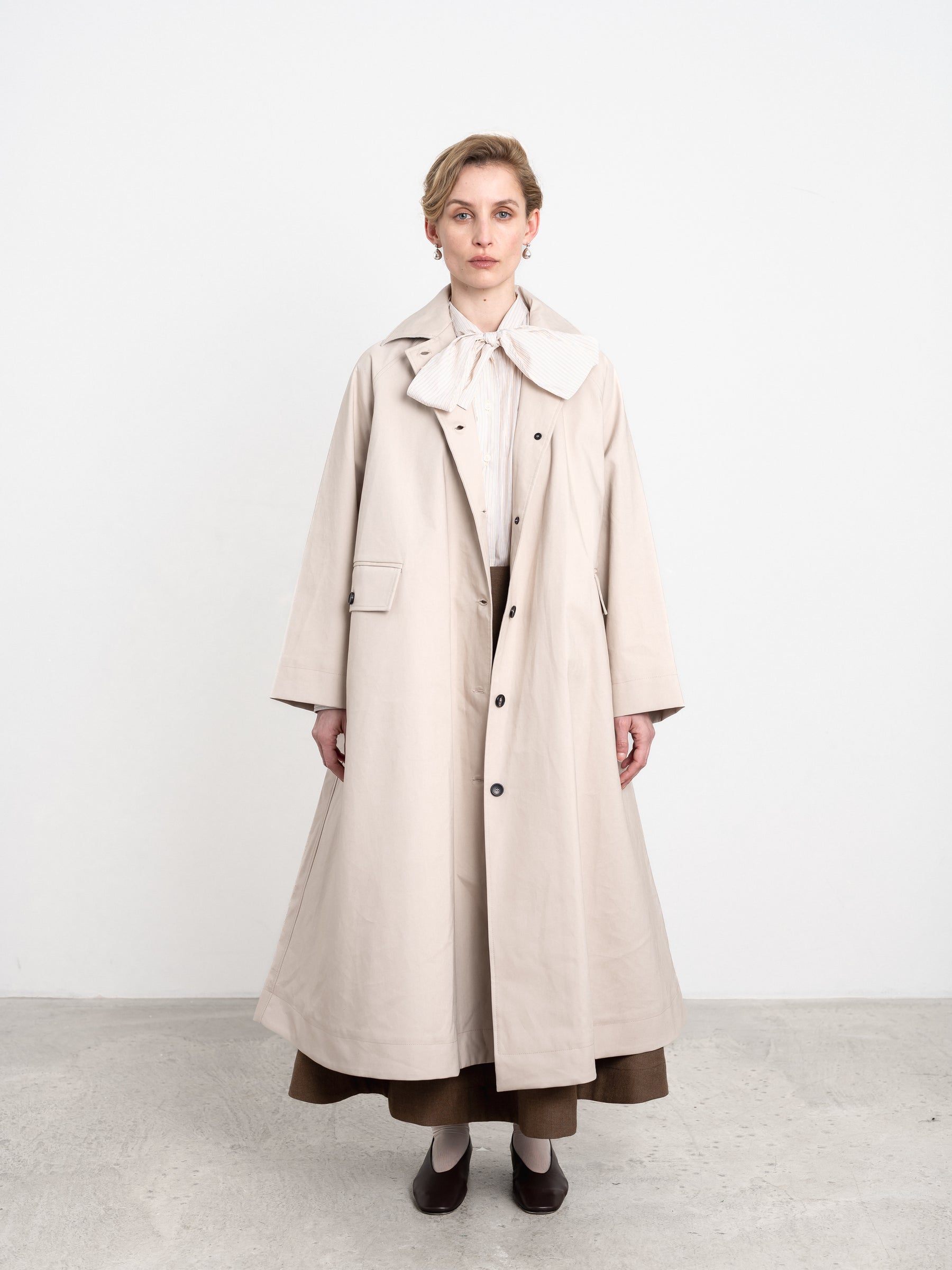 OUR KIT TRENCH UPDATED IN 100% COTTON BRITISH GABARDINE FABRIC - A DENSELY WOVEN FABRIC THAT IS DURABLE, VERSATILE AND SHOWERPROOF. PERFECT FOR FALL SHOWERS, THE KIT TRENCH IS AN OVERSIZED STYLE FEATURING A STORM SHIELD, FRONT POCKETS WITH BUTTON FLAPS, REMOVABLE BELT AND BACK VENT.