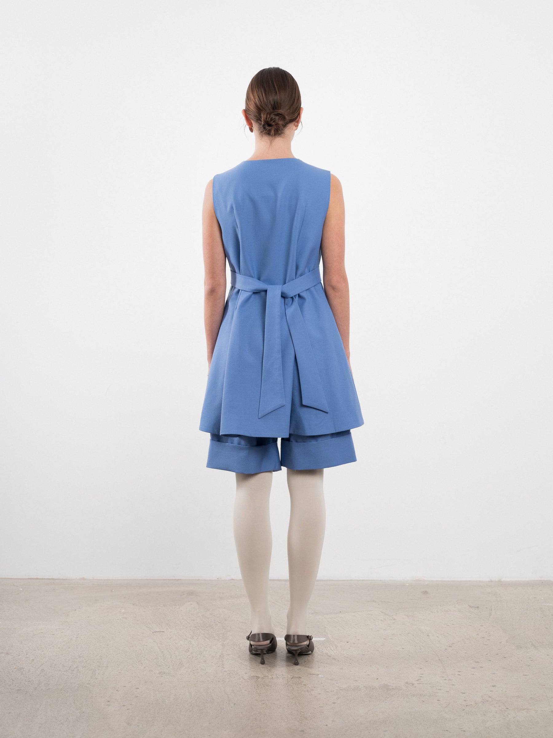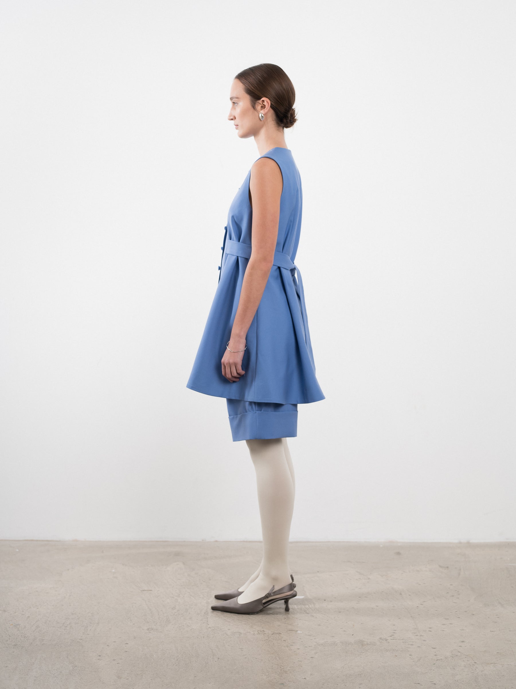 REDEFINING THE CLASSIC WAISTCOAT, THE FLO MINI DRESS IS CRAFTED FROM 100% BRITISH WOOL IN A STAND-OUT CORNFLOWER BLUE. THE BUTTON-THROUGH FRONT MAKES THE DRESS PERFECT FOR LAYERING OR WEARING ON ITS OWN. THE TAILORED BODICE AND WAIST TIE CREATES PLAYFUL SUBTLY FLARED SILHOUETTE.