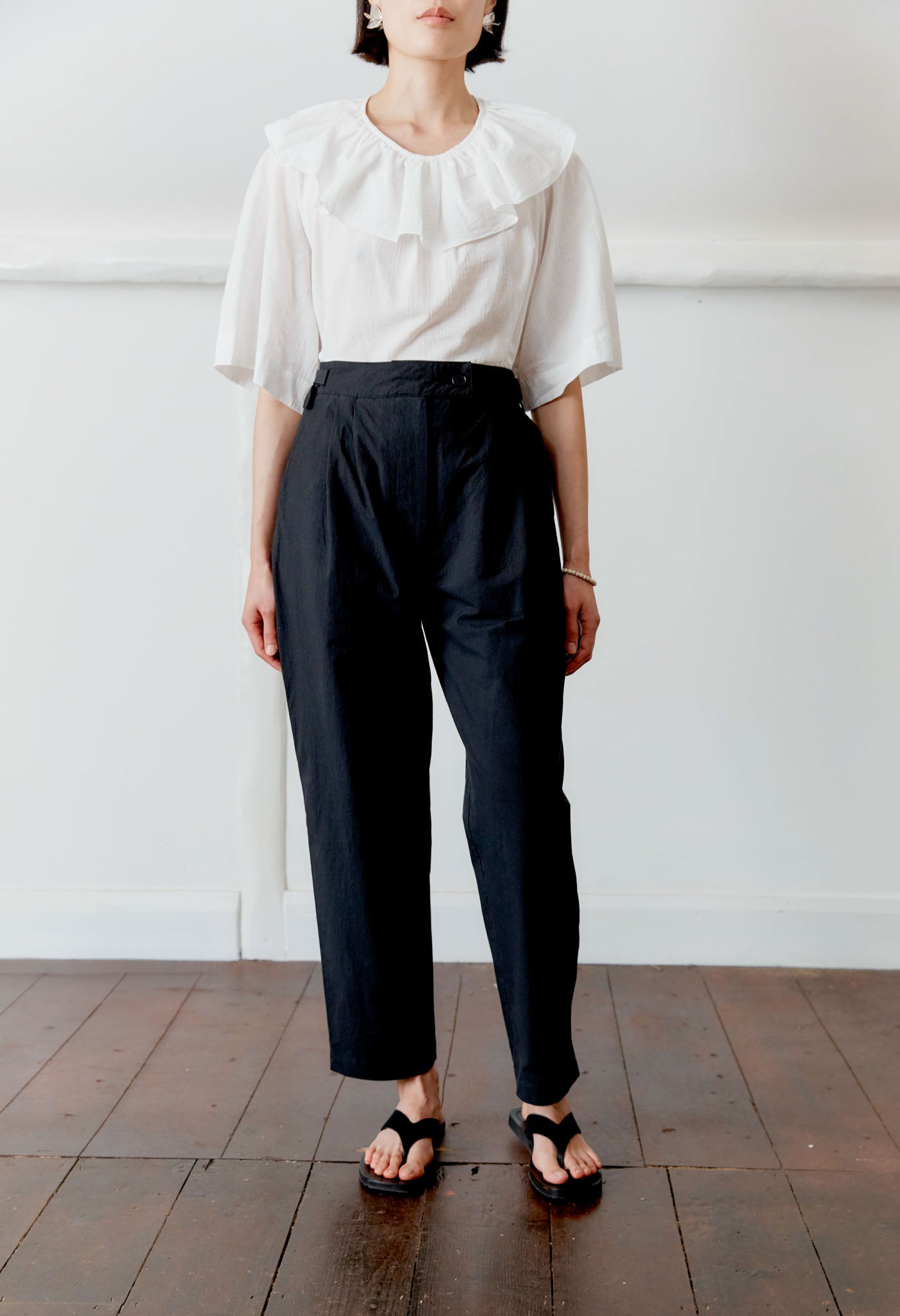 NEW FOR SPRING SUMMER, THE ENYA TROUSERS ARE A RELAXED TAILORED TROUSER FEATURING SOFT PLEATING AT THE FRONT AND BACK WAISTBAND DARTS, PROMISING ROOM TO MOVE FREELY. DESIGNED WITH SIDE SEAM POCKETS, AND ONE BACK JET POCKET. FINISHED WITH ADJUSTABLE WAISTBAND SLIDERS TO CINCH IN THE WAIST IF DESIRED. THESE ARE THE PERFECT TRANS-SEASONAL STAPLE WITH ELEVATED EASE.