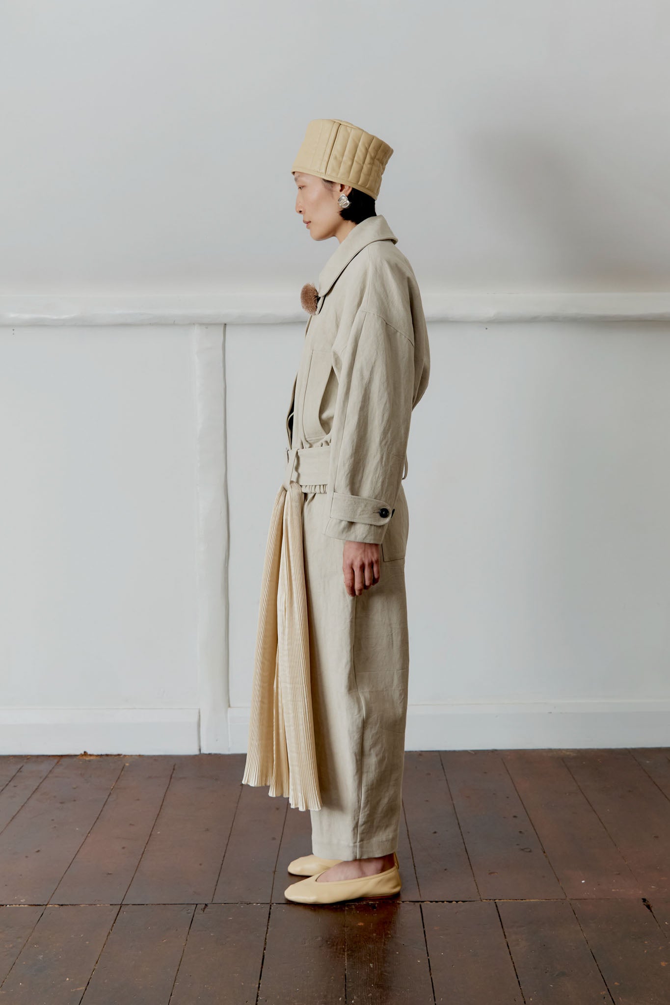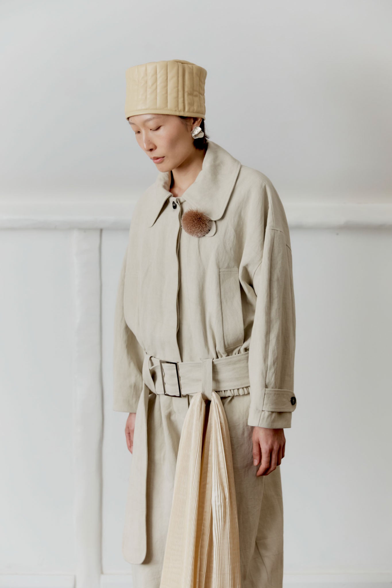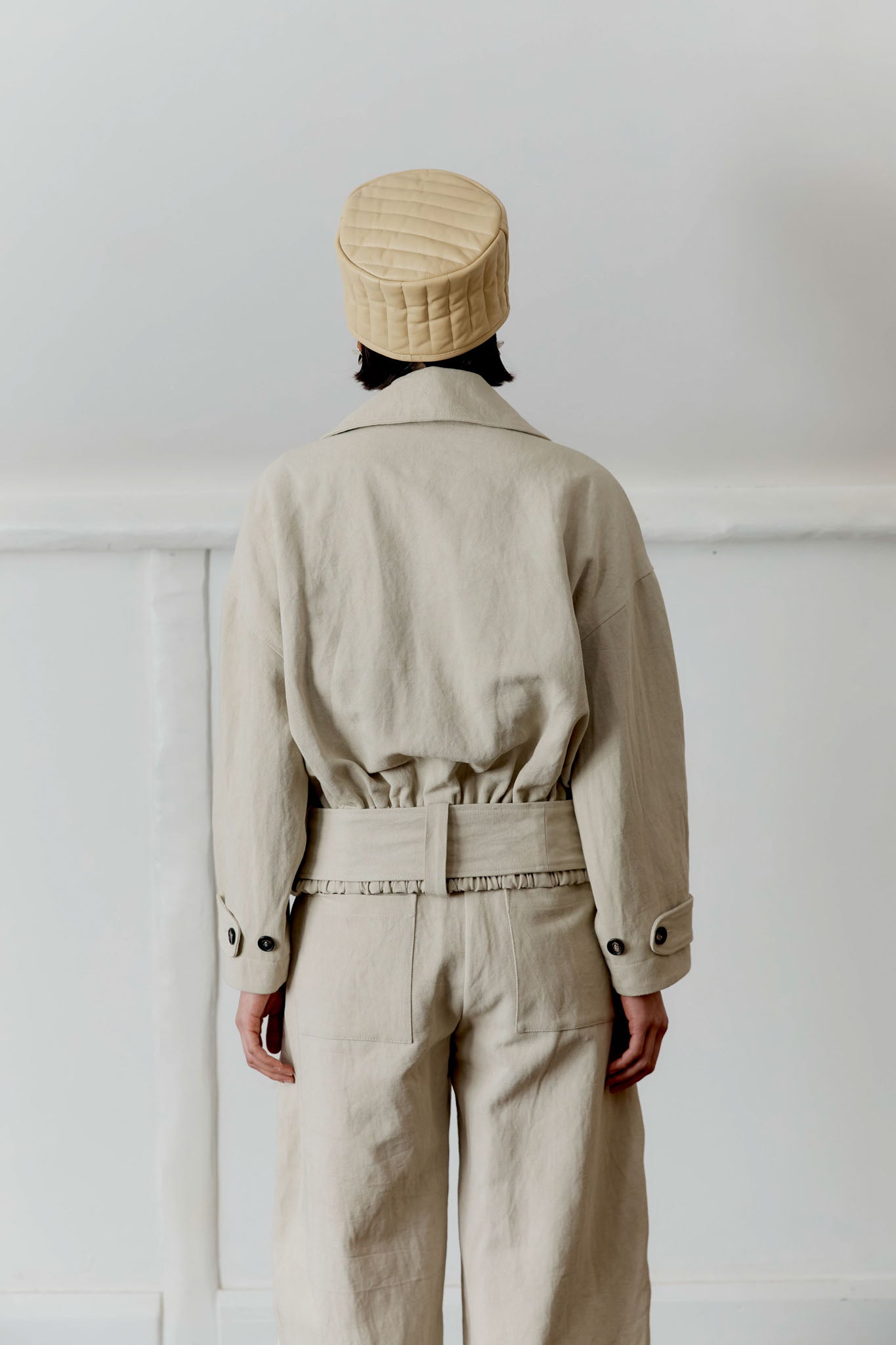 THE NARA JACKET, NEW FOR SS26, IS AN OVERSIZED, BOXY BUTTON-FRONT BLOUSON. IT IS CUT FROM JAPANESE COTTON DRILL, KNOWN FOR ITS CRISP TOUCH AND WINKLED APPEARANCE FROM THE SUN-DRYING PROCESS. IT FEATURES A CURVED COLLAR WITH NECK GUARD, VERTICAL WELT POCKETS, AND A CONCEALED HORN-BUTTON PLACKET. BUTTONED CUFFS AND A DEEP ELASTICATED HEM WITH REMOVABLE BELT CREATE GENEROUS PROPORTIONS THROUGH THE BODY TO PRODUCE A HIGH VOLUME SILHOUETTE, CREATING A BLOUSED EFFECT.