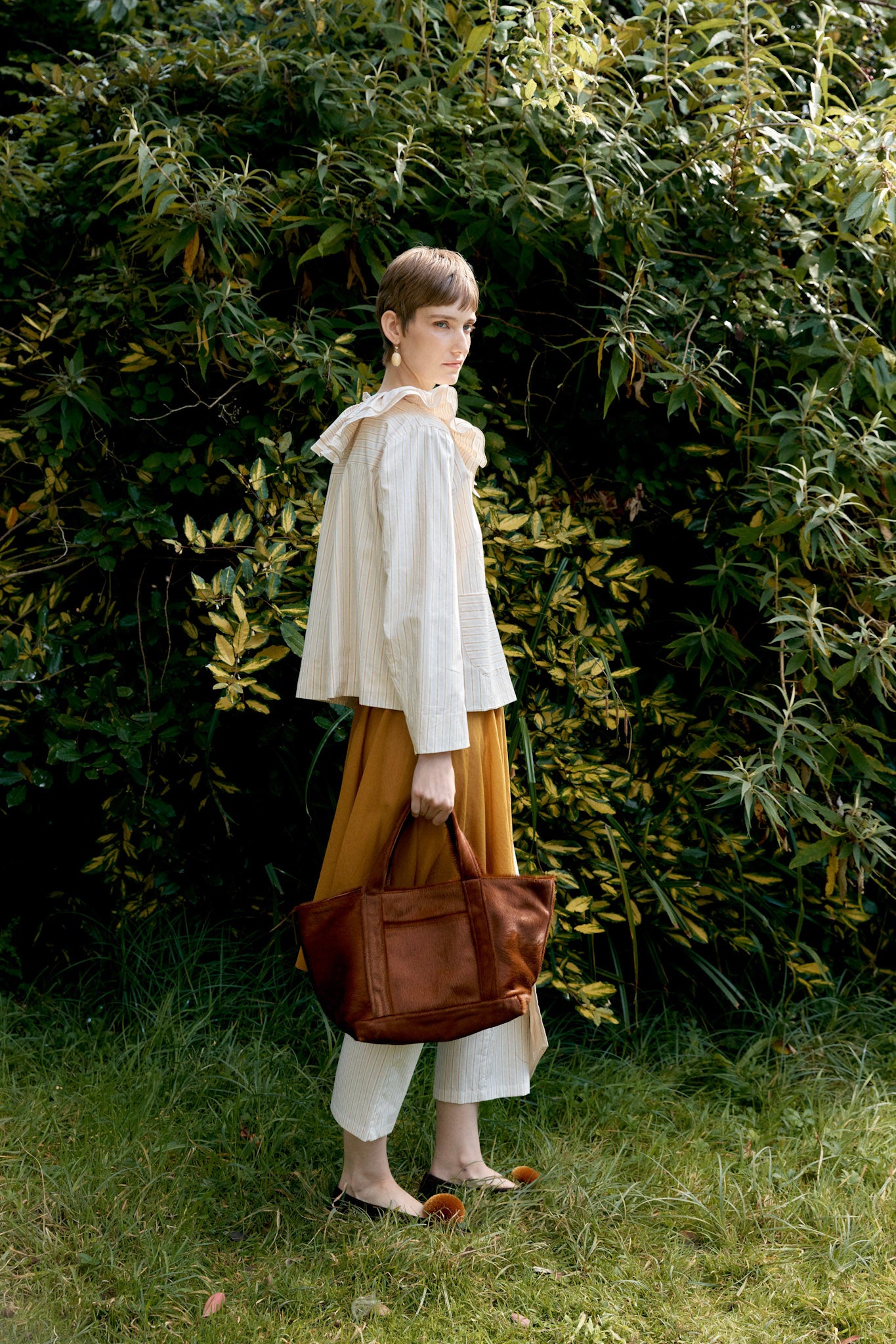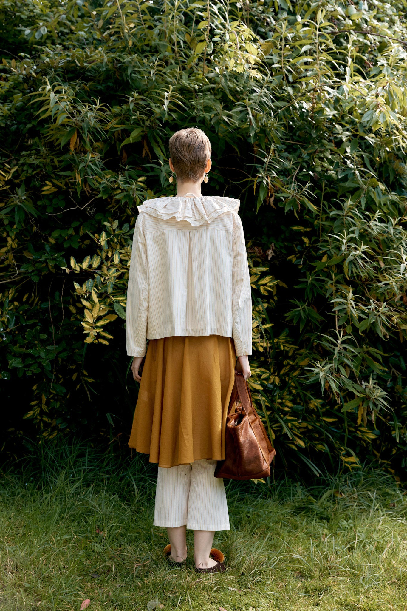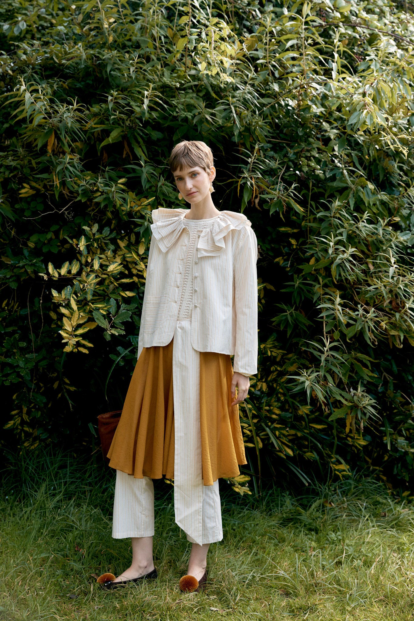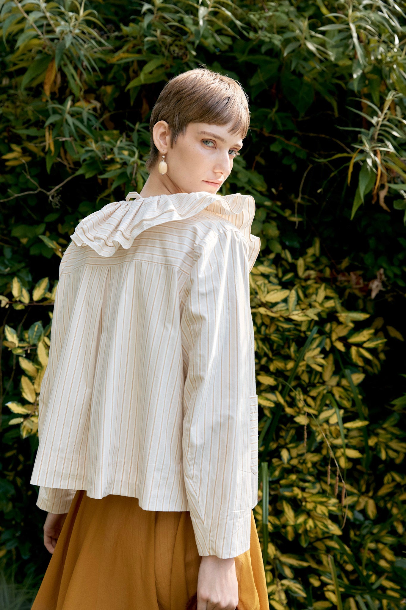 A SLIGHTLY CROPPED JACKET MADE FROM SOFT AN APRICOT STRIPED JAPANESE ORGANIC COTTON. A DOUBLE RUFFLED COLLAR ADDS A PLAYFUL ADDITION TO OUR CLASSIC AND MUCH-LOVED JACKET. THE ROWAN FEATURES ONE PATCH POCKET AND SELF COVERED BUTTONS.