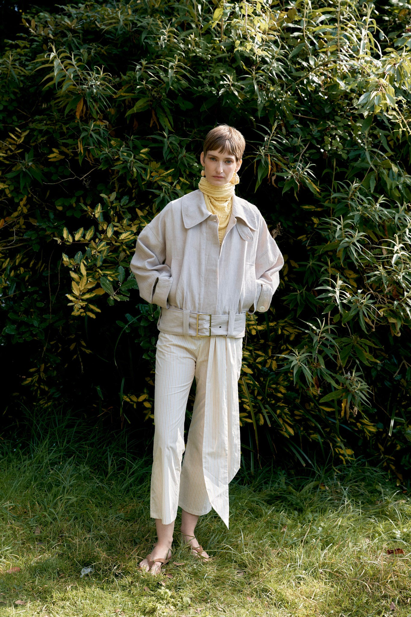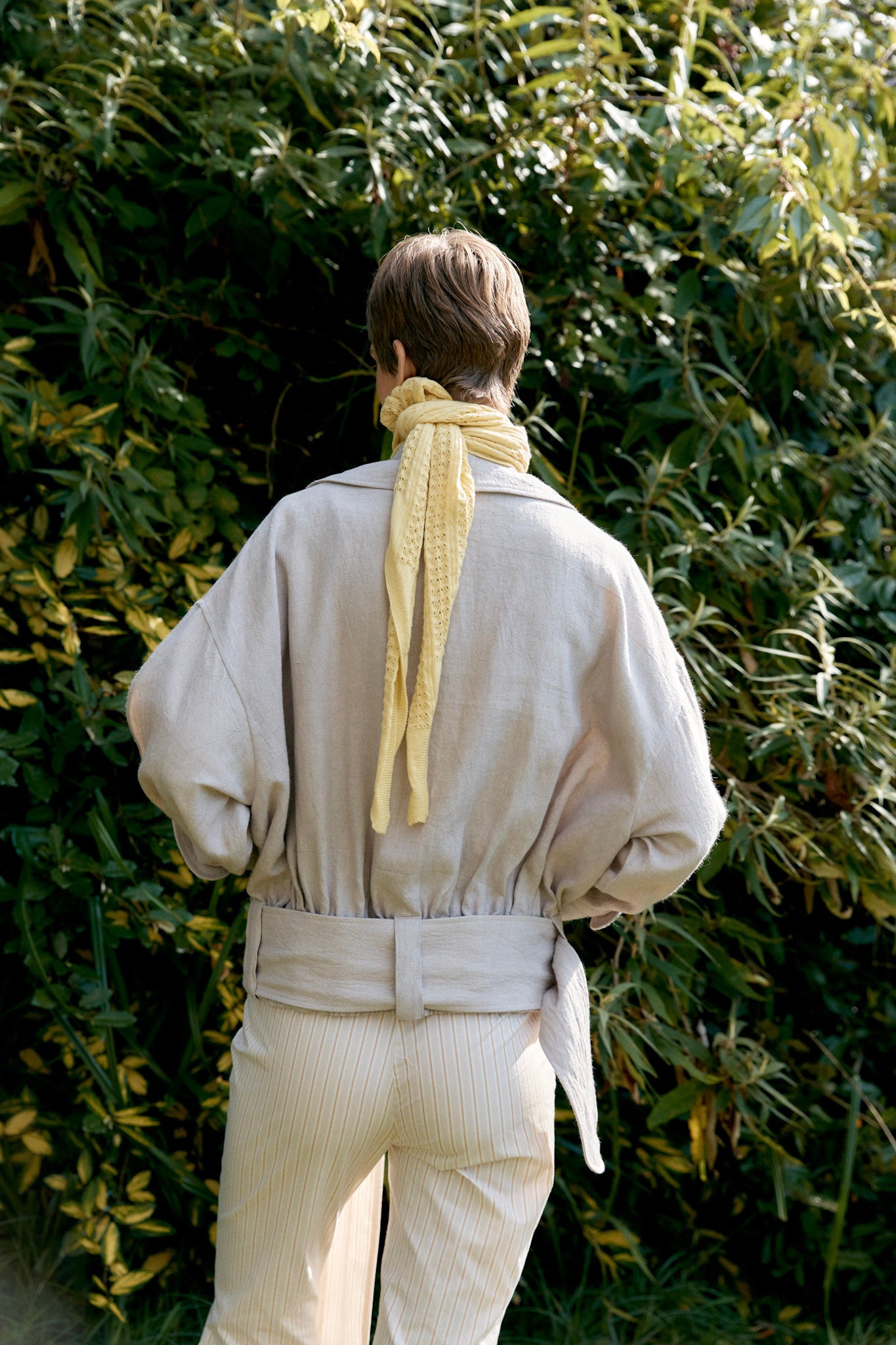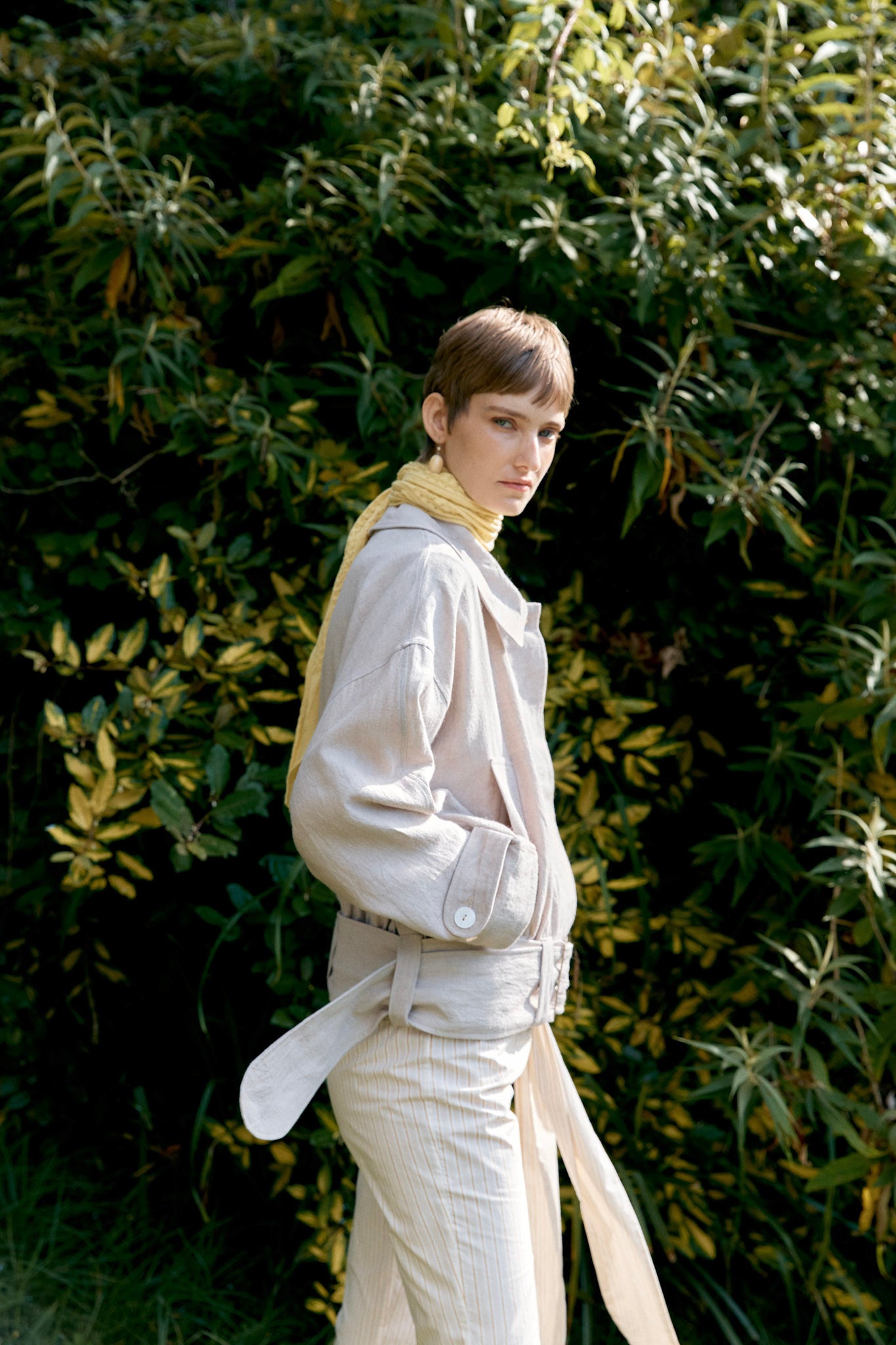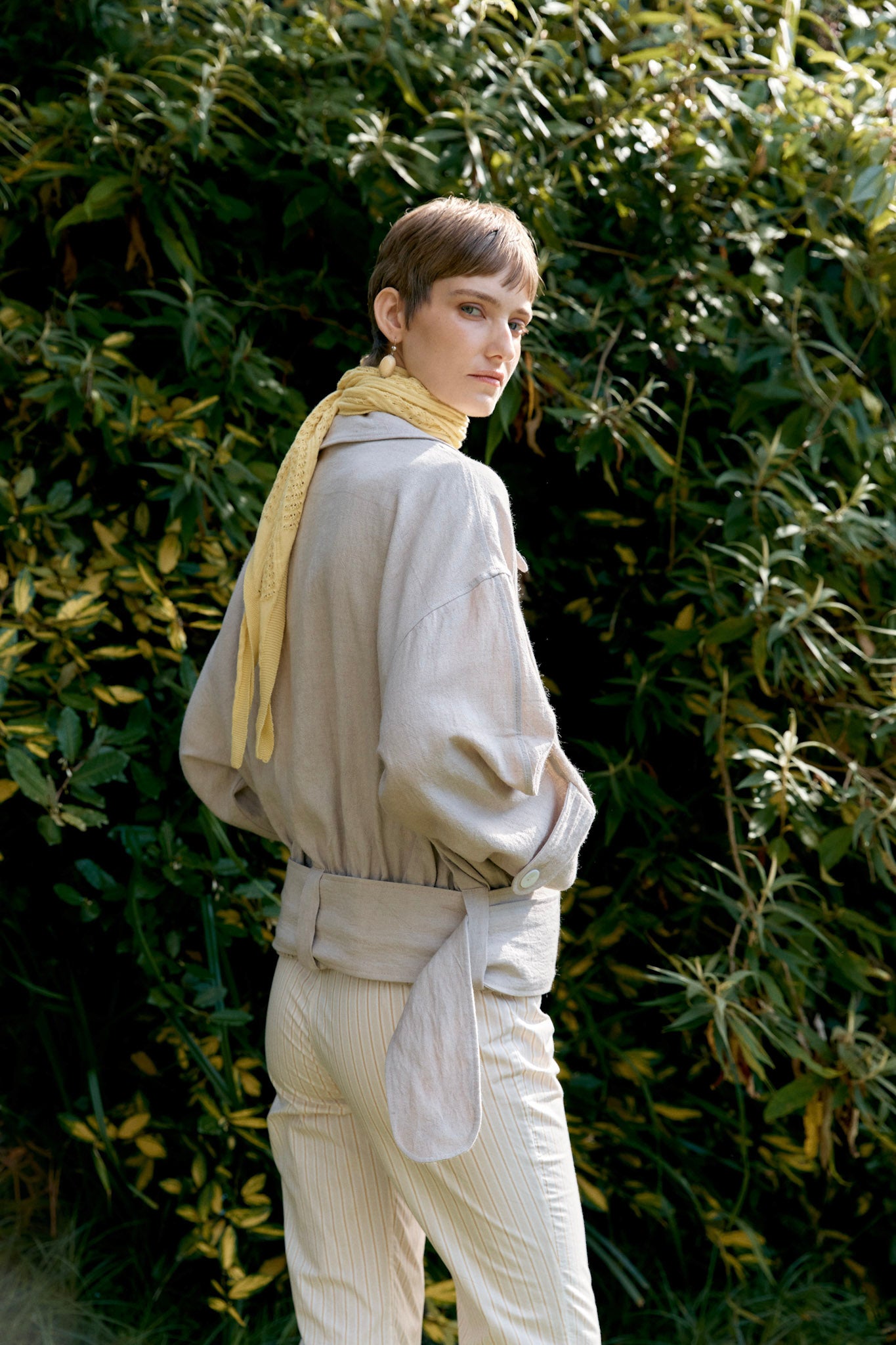 THE NARA JACKET, IS AN OVERSIZED, BOXY BUTTON-FRONT JACKET. IT IS CUT FROM WASHED PINK JAPANESE RAMIE/LINEN, KNOWN FOR ITS WINKLED APPEARANCE AND DRY TOUCH. IT FEATURES A CURVED COLLAR WITH NECK GUARD, VERTICAL WELT POCKETS, AND A CONCEALED HORN-BUTTON PLACKET. BUTTONED CUFFS AND A DEEP ELASTICATED HEM WITH REMOVABLE BELT CREATE GENEROUS PROPORTIONS THROUGH THE BODY TO PRODUCE A HIGH VOLUME SILHOUETTE, CREATING A BLOUSED EFFECT.
