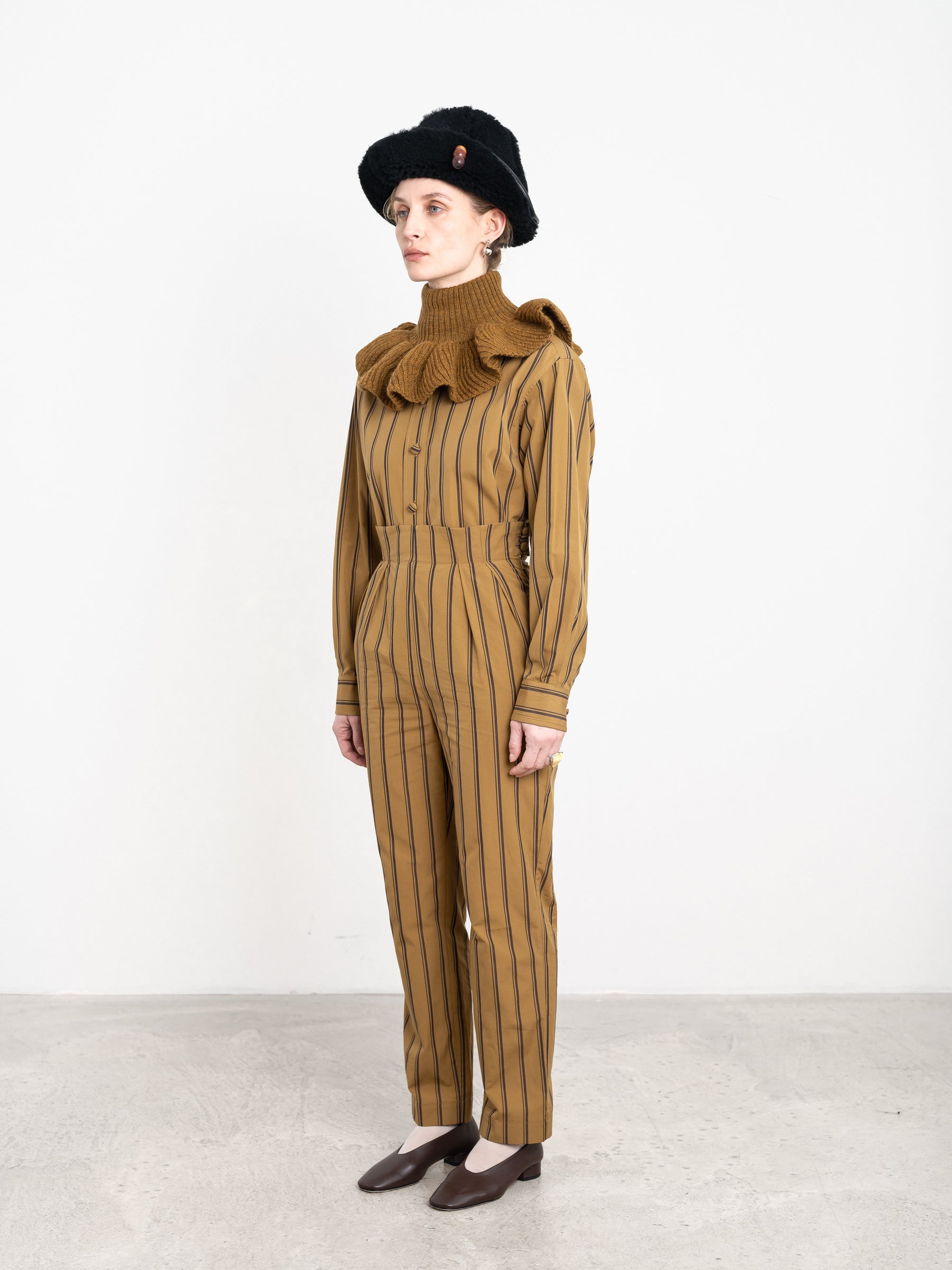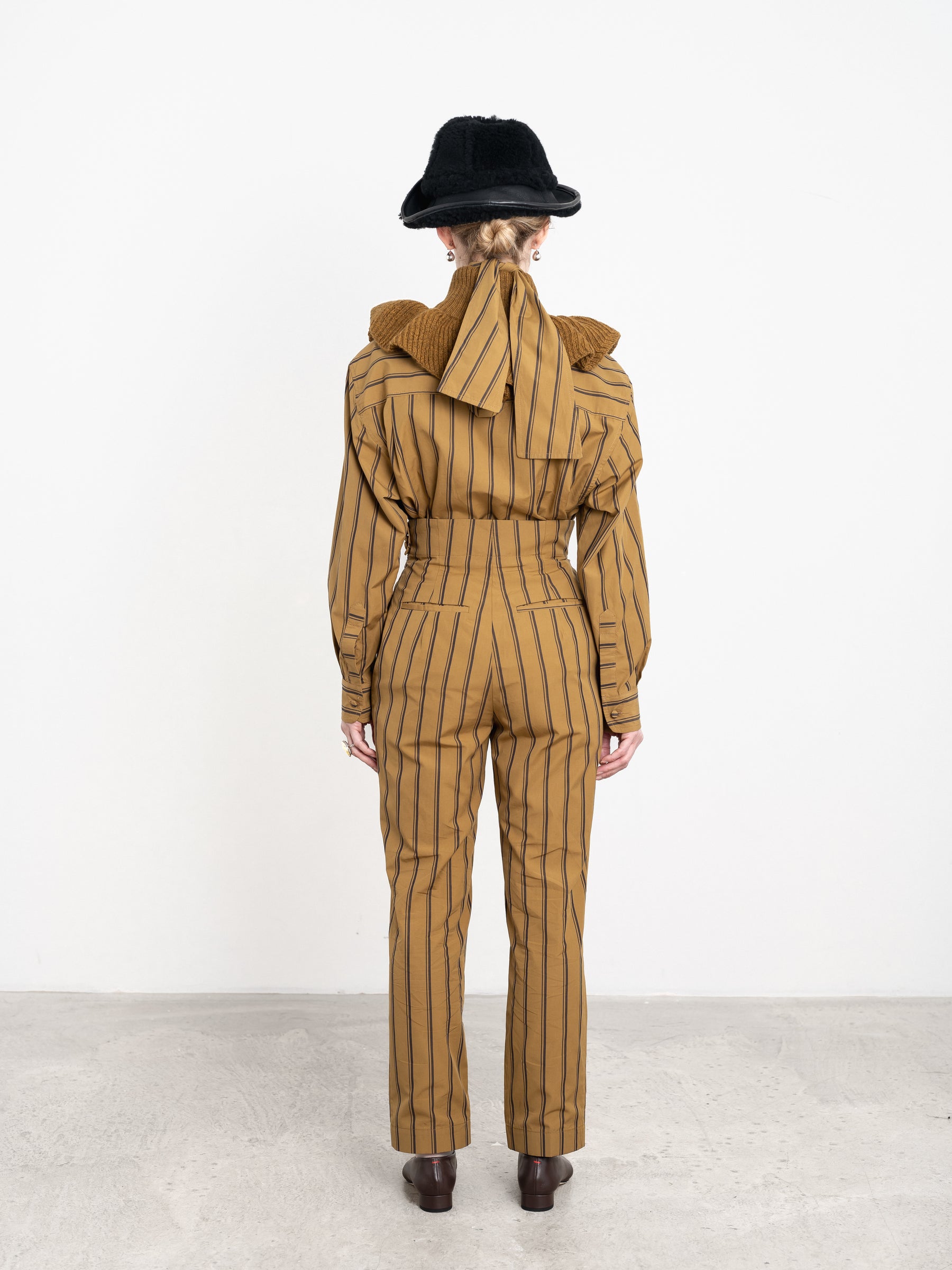 CRAFTED FROM A JAPANESE SILK AND COTTON BLEND, THE TROUSERS ARE DETAILED WITH FRONT PLEATS, SIDE SEAM POCKETS AND SIDE WAISTBAND BUTTON CLOSURE. PAIR WITH THE HATTIE SHIRT IN MATCHING FABRIC FOR A STRIPE ON STRIPE LOOK.