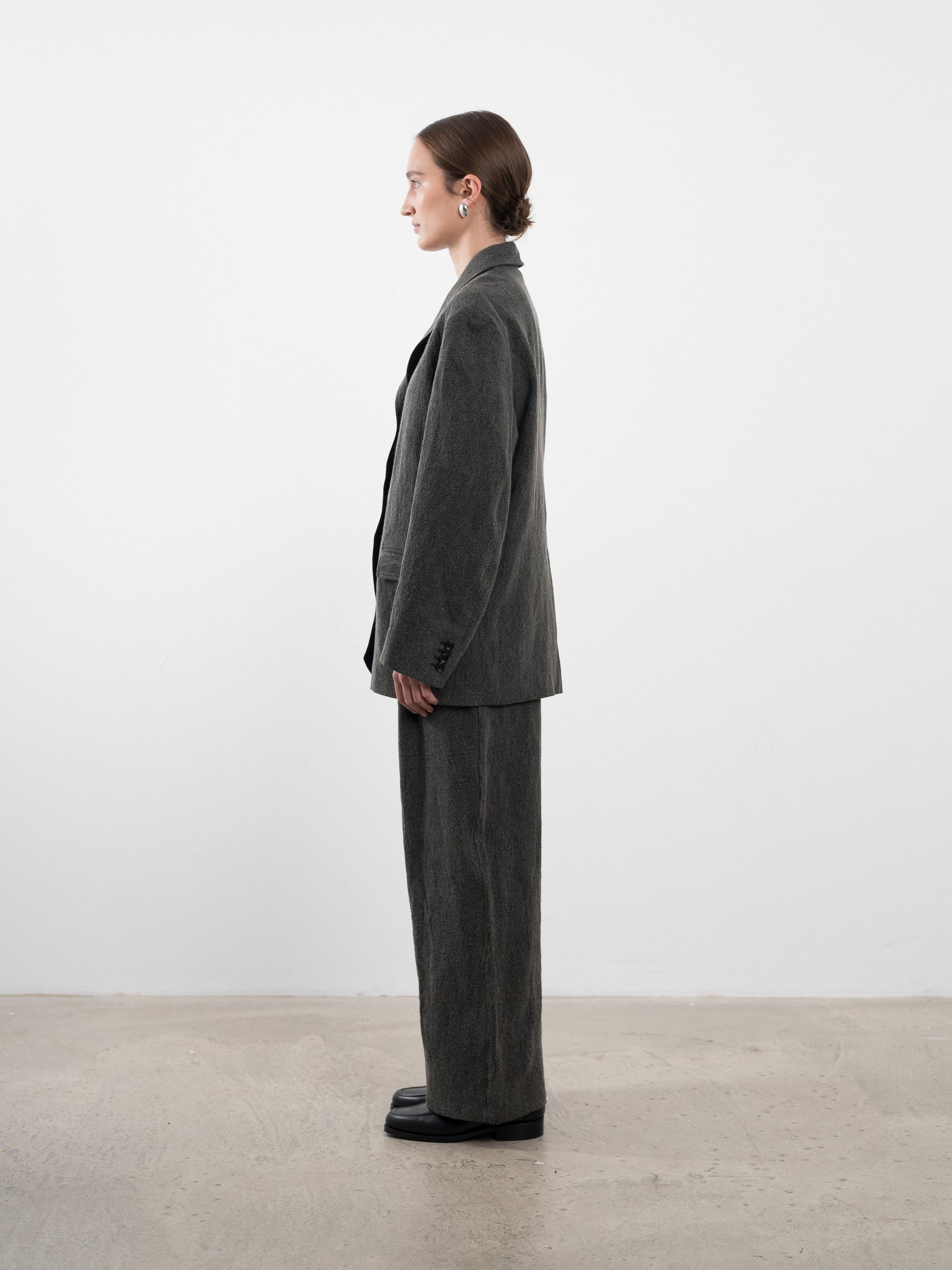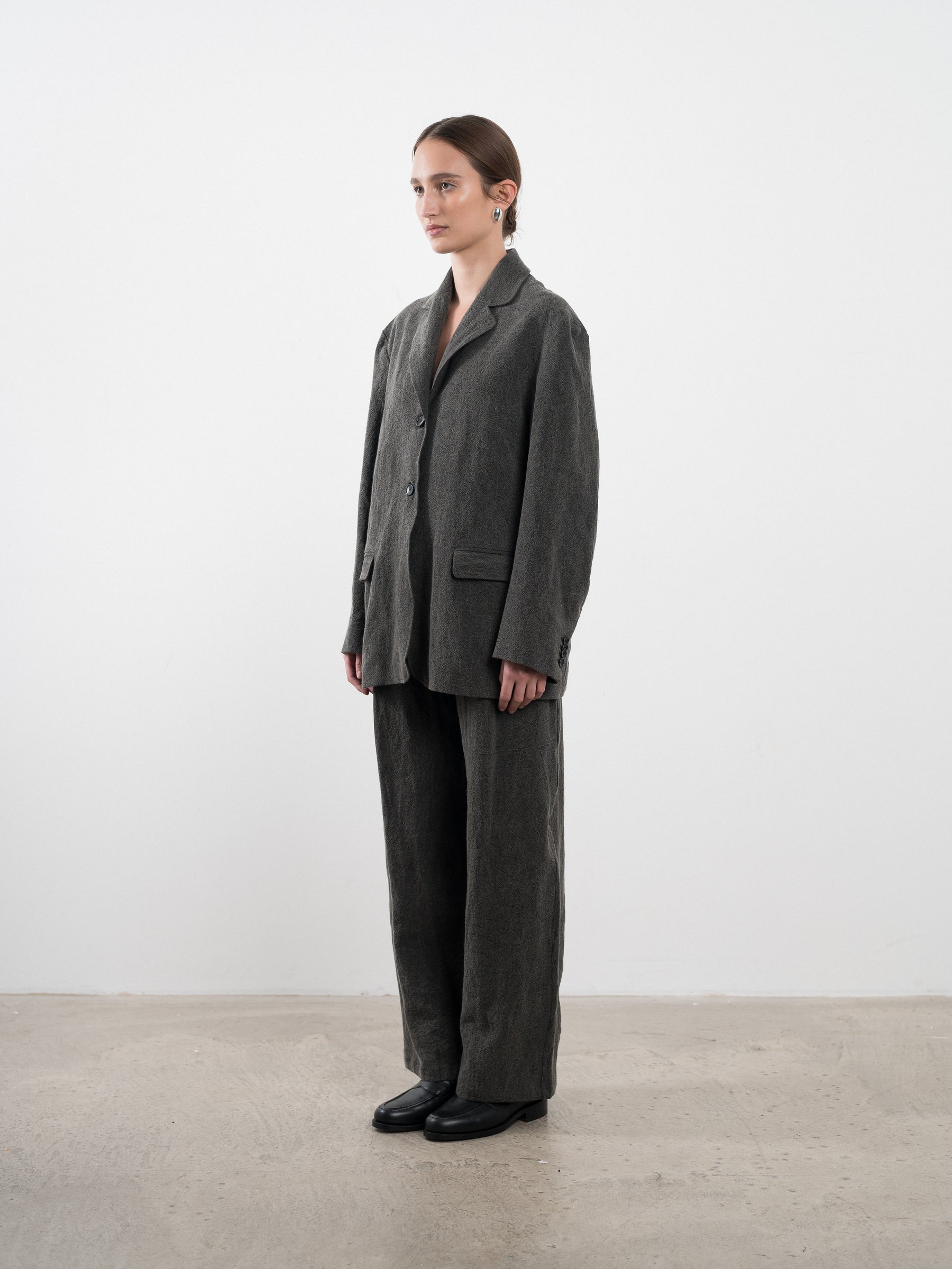 THE CLASSIC ANDIE BLAZER CUT IN A LIGHTWEIGHT TEXTURED JAPANESE LINEN FABRIC. A SLIGHTLY BOXY FIT WITH OVERSIZED SHOULDERS, FEATURING TWO FRONT POCKETS WITH FLAP AND A TWO-HORN BUTTON CLOSURE.