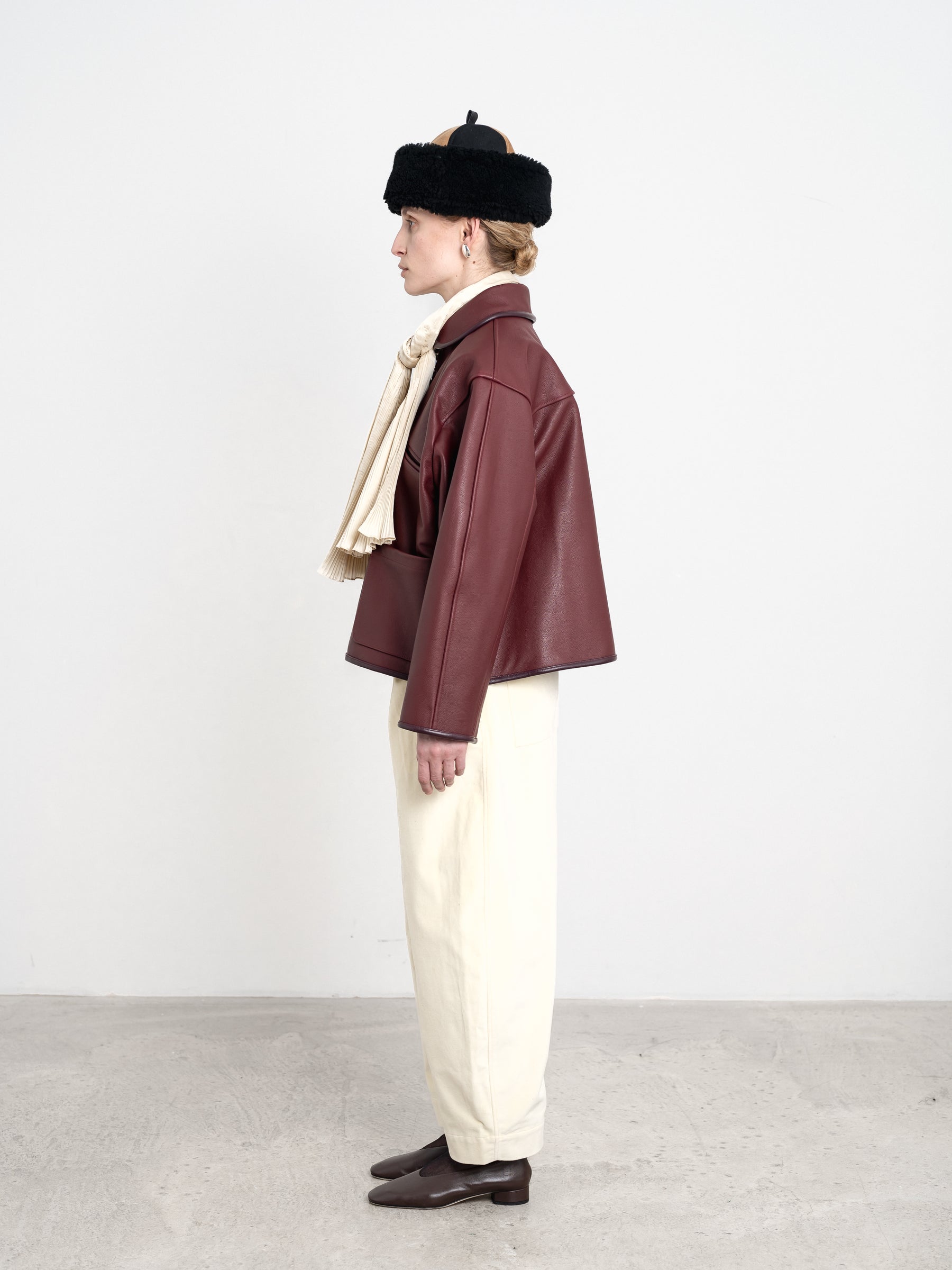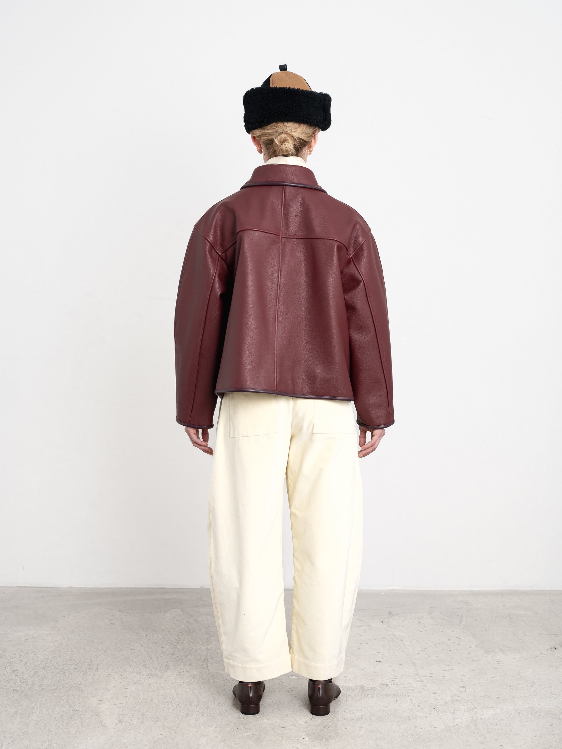 INSPIRED BY VINTAGE AVIATION JACKETS, THE LEATHER FLYING JACKET HAS A LOOSE AND SEMI CROPPED SILHOUETTE. CUT FROM SOFT WINE COLOURED LEATHER, THE JACKET IS FINISHED WITH TWO PATCH POCKETS, CHEST JET POCKETS, MATCHING LEATHER BINDING AND AN OVERLAPPING ZIP CLOSURE. THE PURPOSEFUL ROOMY FIT ALLOWS YOU TO WRAP UP IN THE COOLER MONTHS.