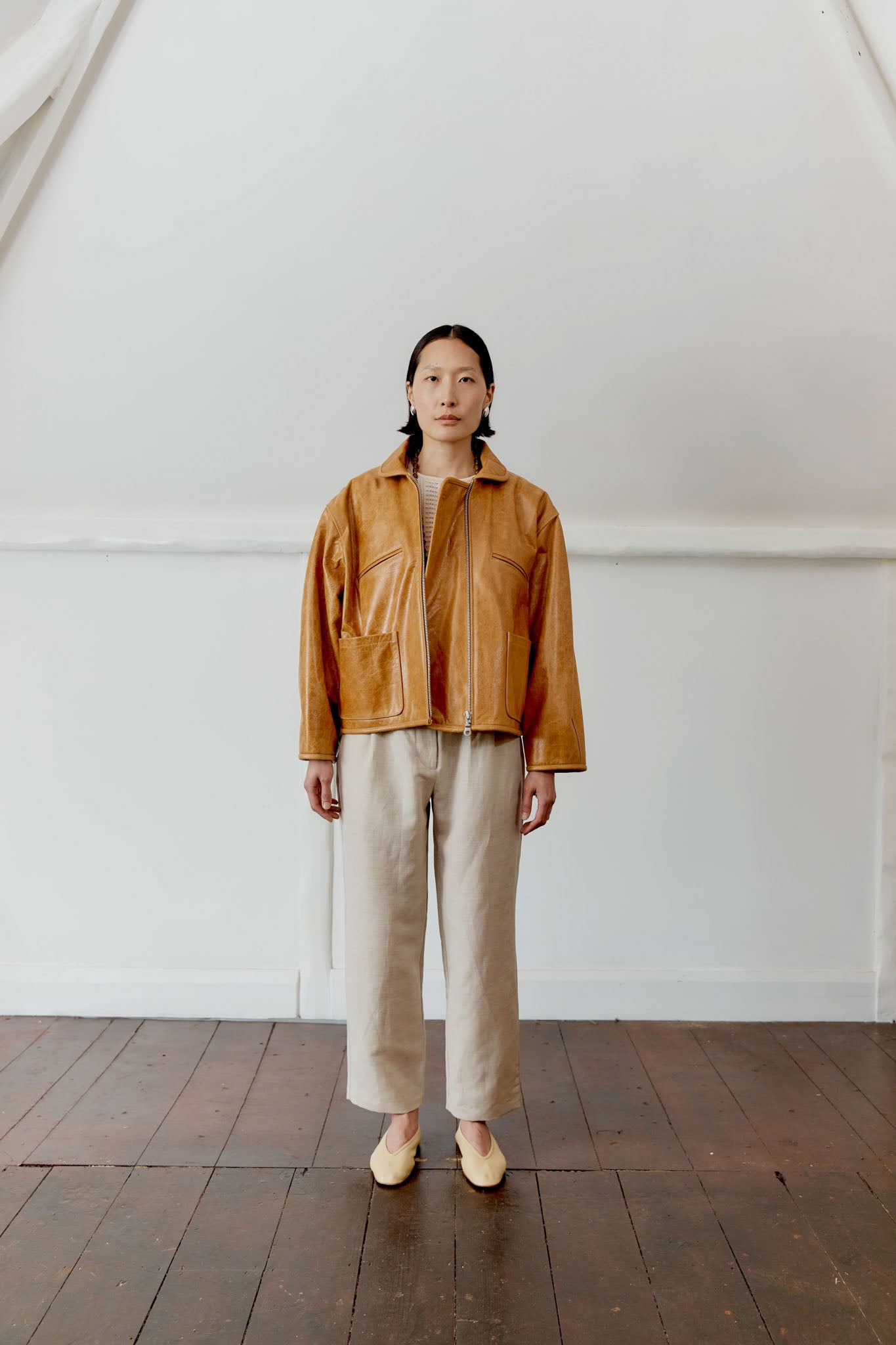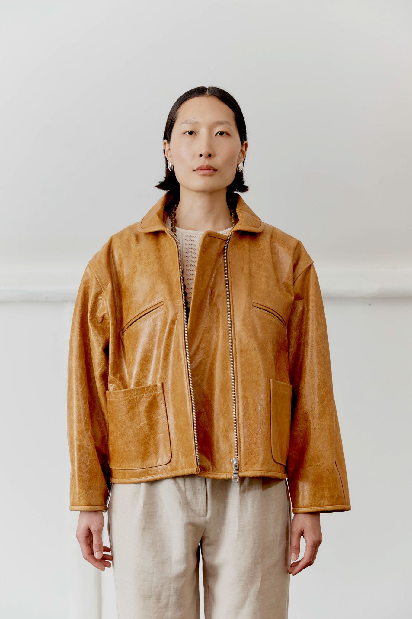 INSPIRED BY VINTAGE AVIATION JACKETS, THE LEATHER FLYING JACKET HAS A LOOSE AND SEMI CROPPED SILHOUETTE. CUT FROM A HARD-WEARING OAK COLOURED LEATHER, THE JACKET IS FINISHED WITH TWO PATCH POCKETS, CHEST JET POCKETS, MATCHING LEATHER BINDING AND AN OVERLAPPING ZIP CLOSURE. THE PURPOSEFUL ROOMY FIT ALLOWS YOU TO WRAP UP IN THE COOLER MONTHS.