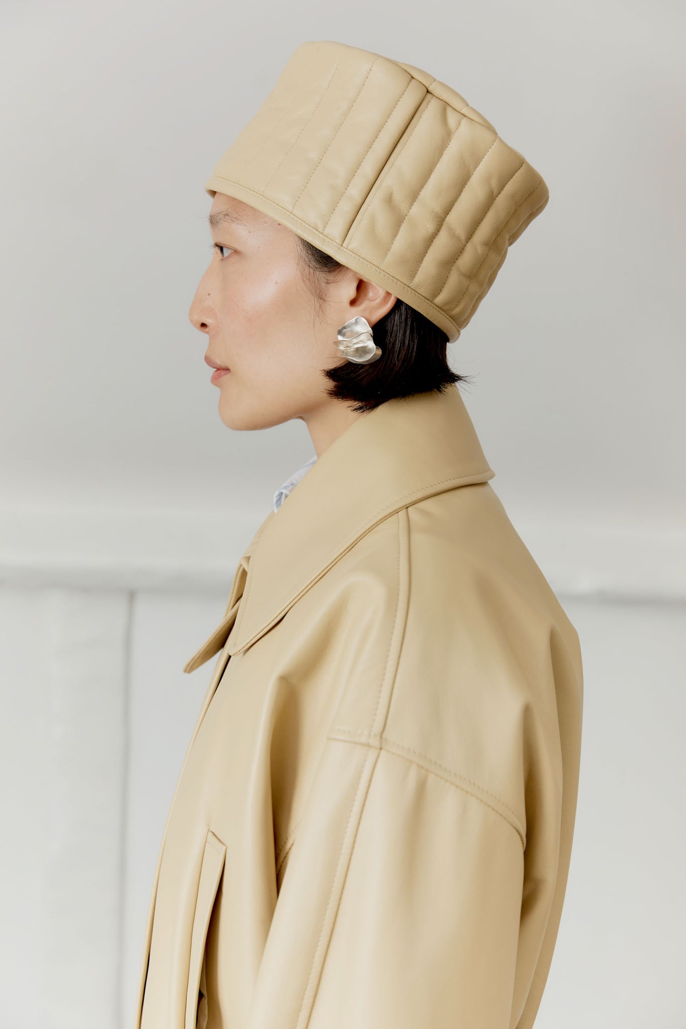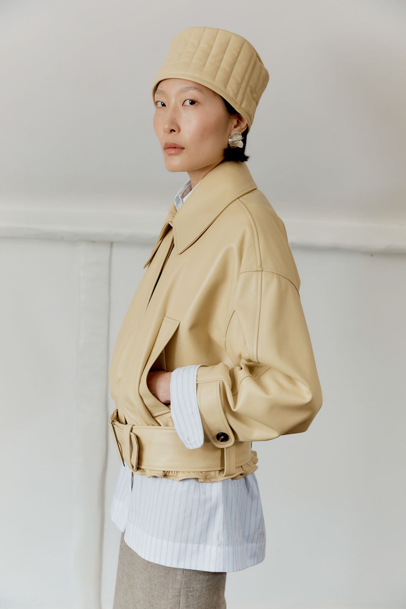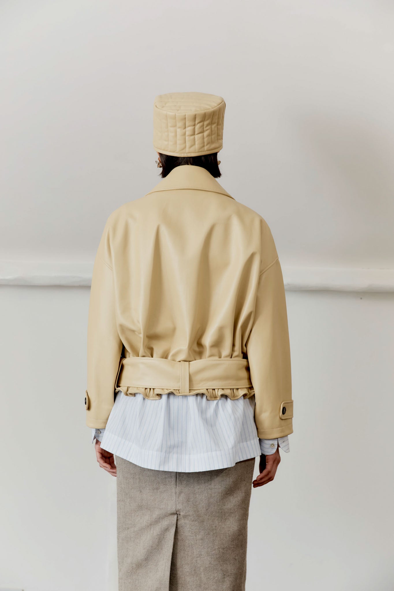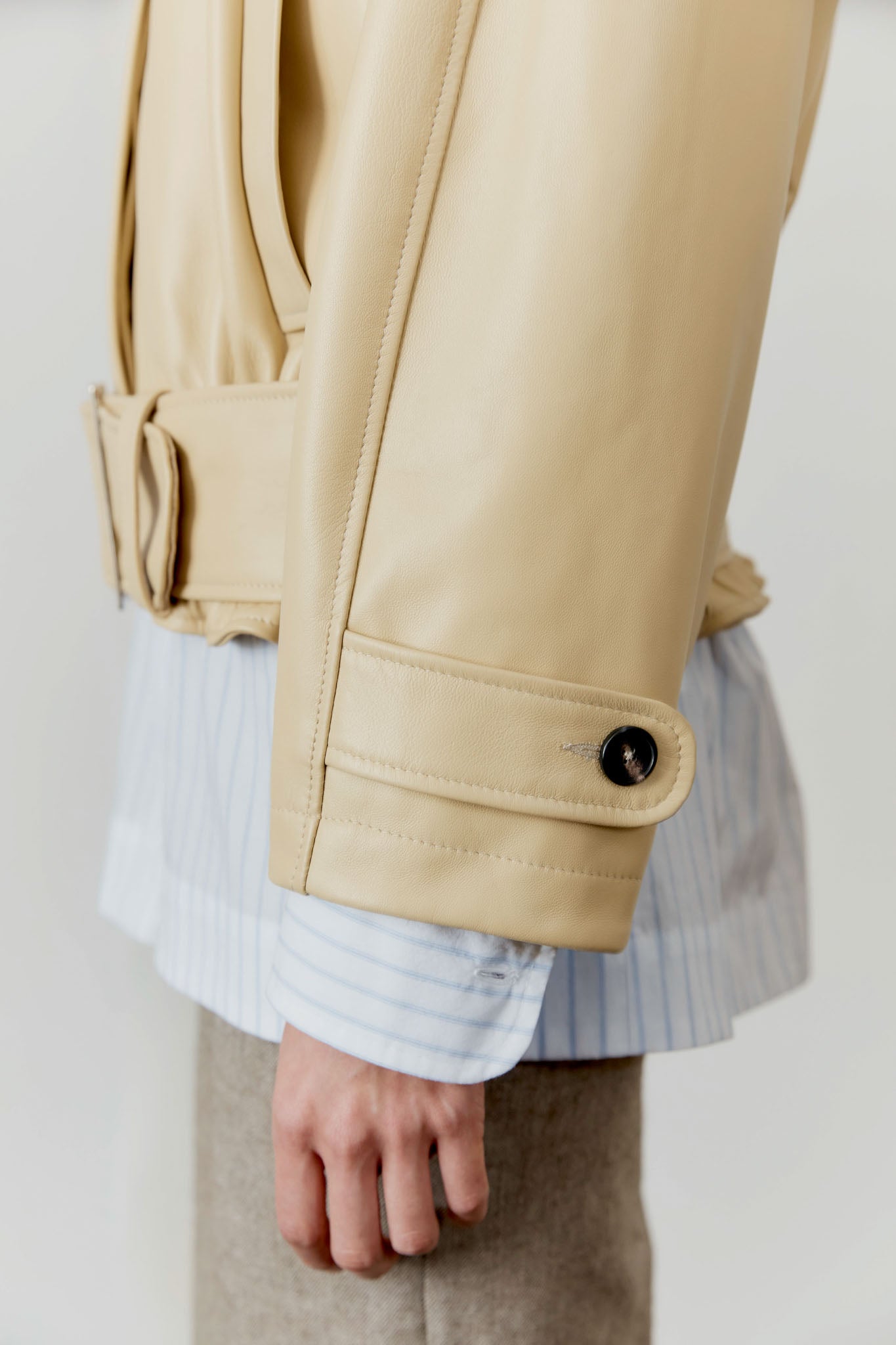 NEW FOR SPRING SUMMER THE NARA JACKET IS AN OVERSIZED, BOXY BUTTON-FRONT BLOUSON JACKET CUT FROM A BUTTERY SOFT YELLOW LEATHER. FEATURES A CURVED COLLAR WITH NECK GUARD, VERTICAL WELT POCKETS, AND A CONCEALED HORN-BUTTON PLACKET. BUTTONED CUFFS AND A DEEP ELASTICATED HEM WITH REMOVABLE BELT CREATE GENEROUS PROPORTIONS THROUGH THE BODY TO PRODUCE A HIGH VOLUME SILHOUETTE, CREATING A BLOUSED EFFECT.