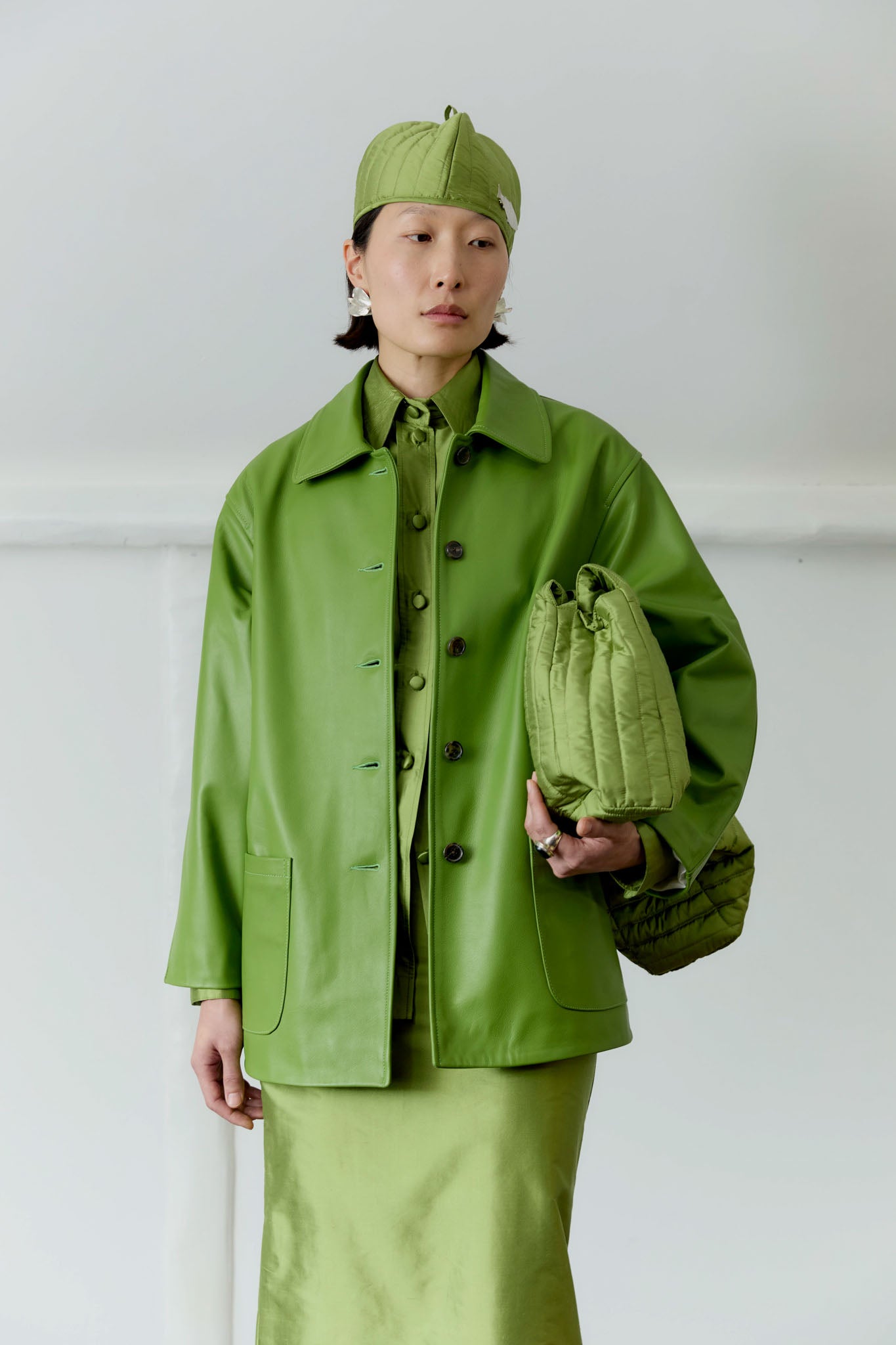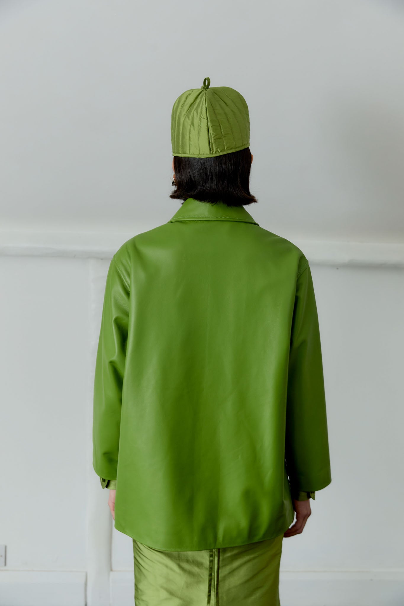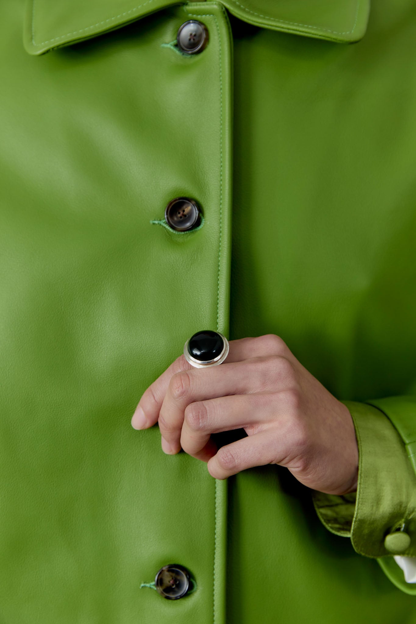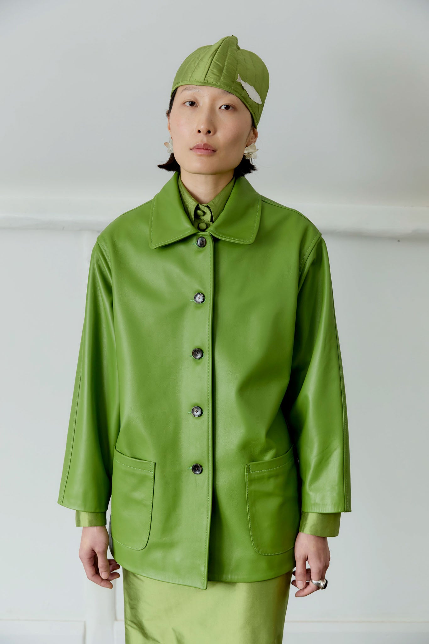THIS MUST-HAVE JACKET IS A NECESSITY FOR ANY WARDROBE. HAND CUT AND SEWN FROM BUTTERY SOFT LEATHER IN A MOOD-LIFTING SPRING GREEN, THE JACKET FEATURES A ROUNDED COLLAR AND A SMOOTH VISCOSE LINING. THE OVERSIZED FIT ALLOWS YOU TO LAYER FOR THE BREEZY SUMMER EVENINGS. FINISHED WITH A HORN BUTTON FRONT CLOSURE AND TWO FRONT PATCH POCKETS.