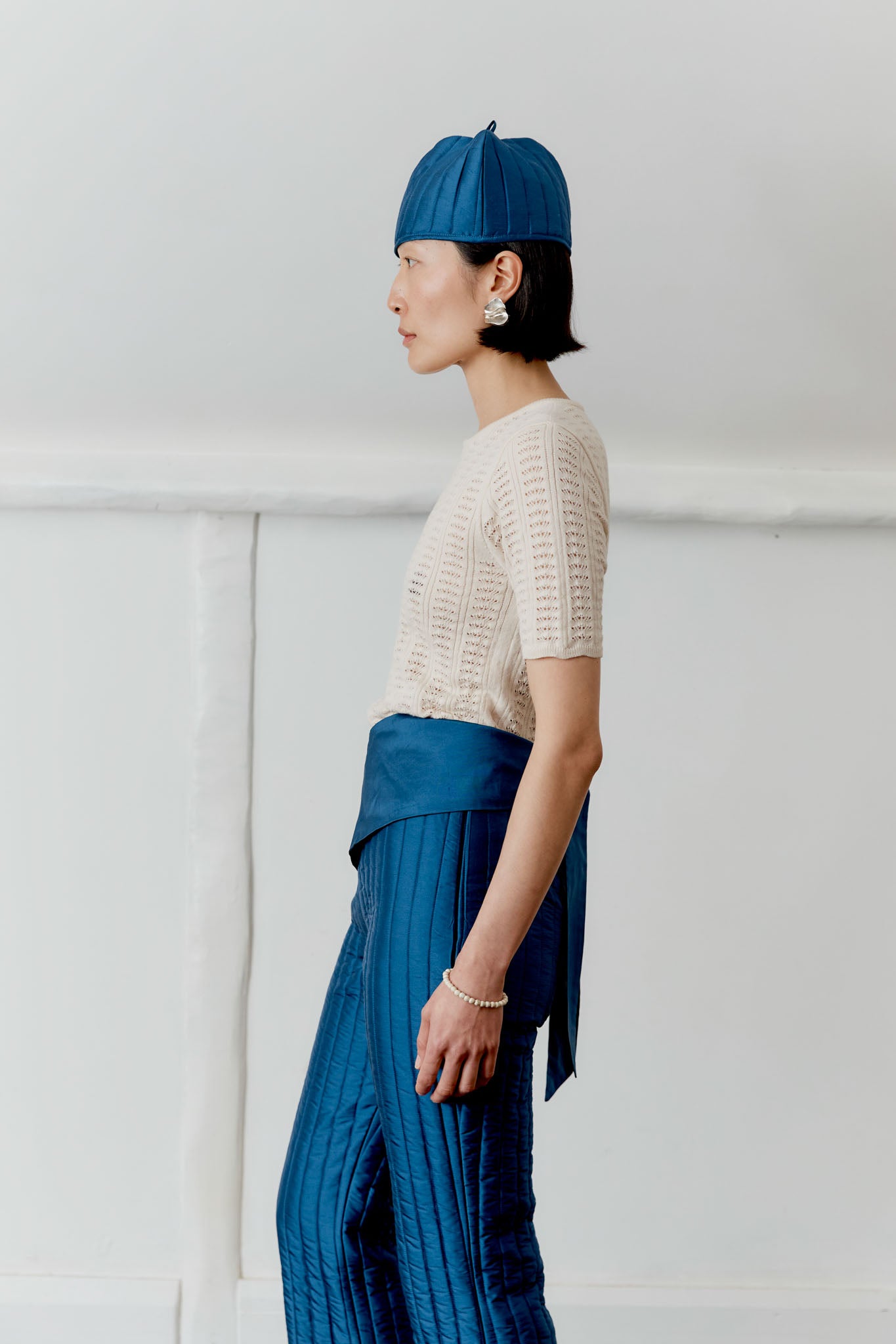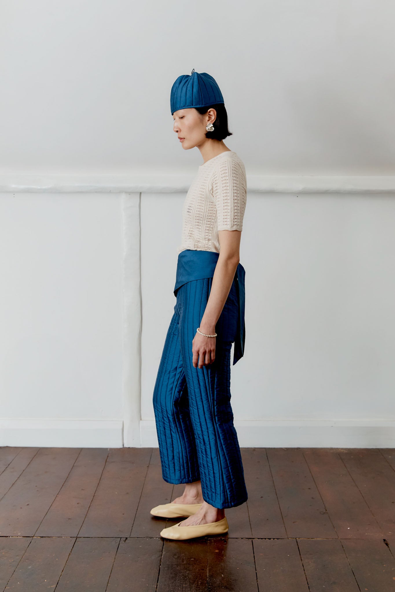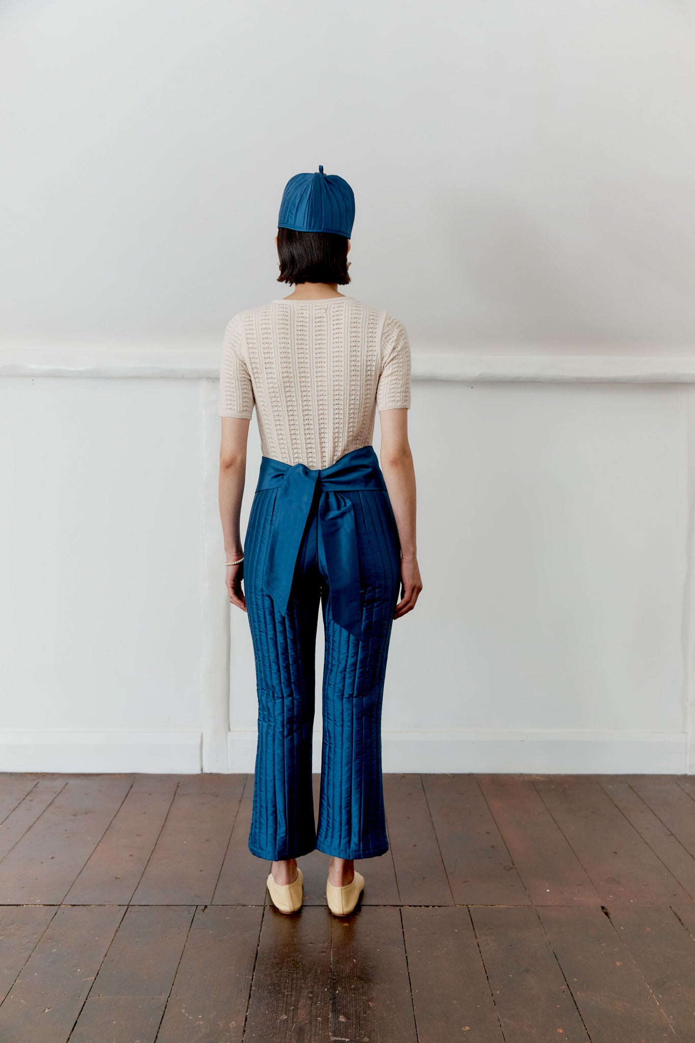 OUR NEW CARMEN TROUSER IN A RICH BLUE COLOURED 100% SILK DUPION AND QUILTED WITH 100% WOOL WADDING FOR ADDITIONAL WARMTH, PERFECT FOR THOSE COOLER SPRING EVENINGS. THIS GIVES THE FABRIC MORE WEIGHT, MAKING IT THE SUITABLE CHOICE FOR TRANSITIONING BETWEEN SEASONS. FEATURES A WRAP-AROUND TIE WAISTBAND IN SMOOTH SILK DUPION.
