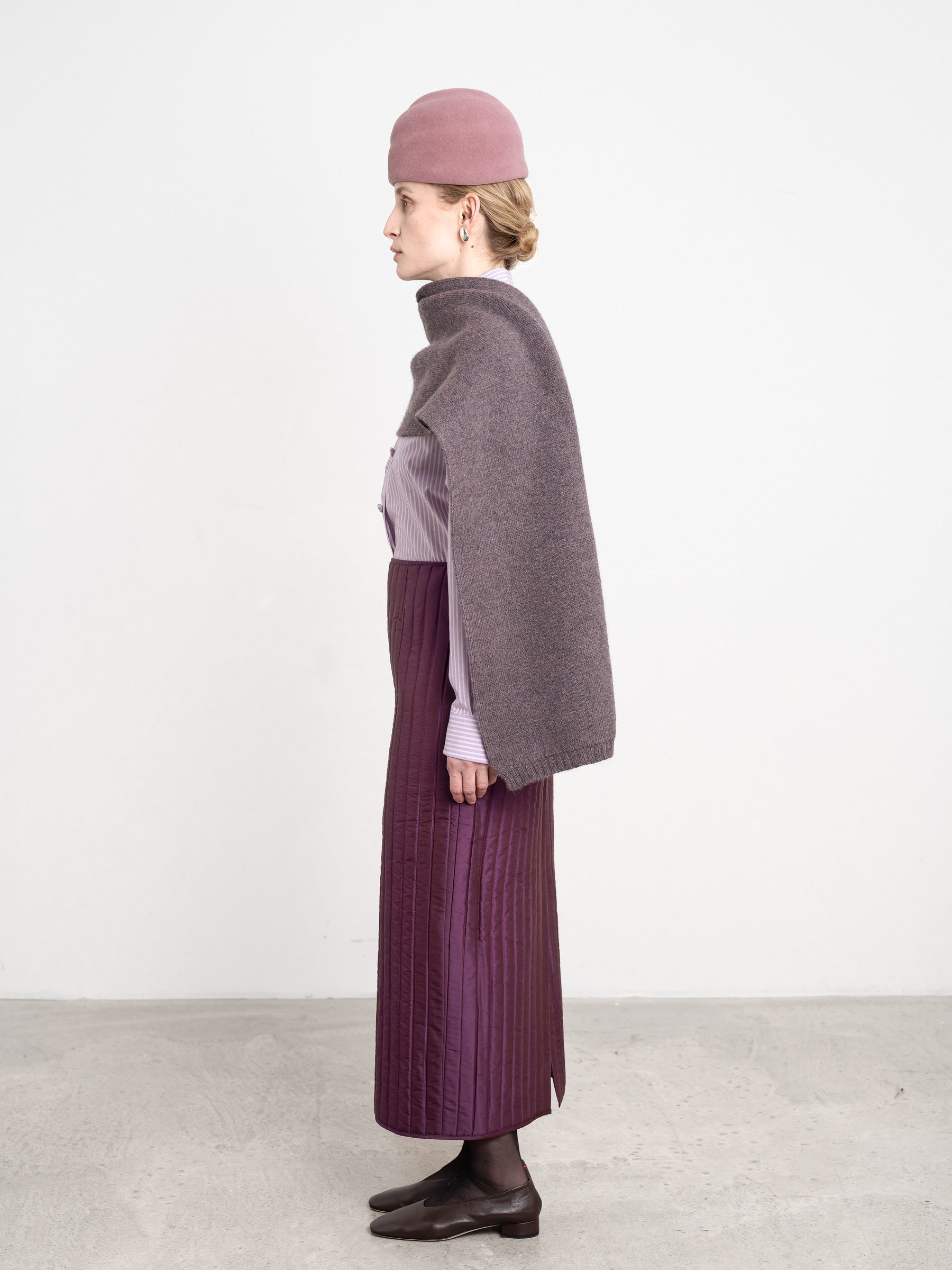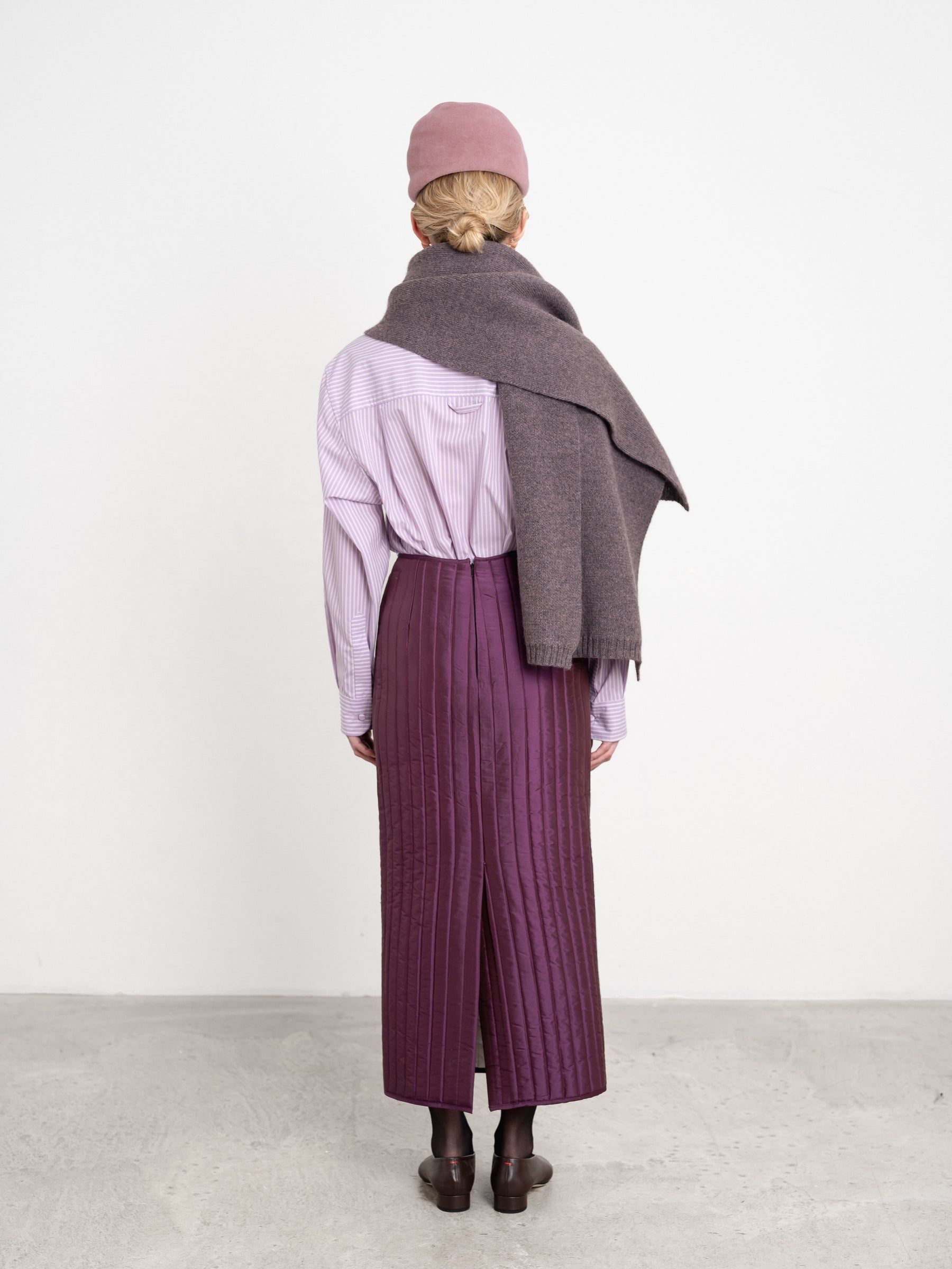 NEW FOR AW25, THE QUILTED PENCIL SKIRT FALLS TO THE ANKLES AND IS CONSTRUCTED FROM PLUM SILK DUPION SANDWICHED BETWEEN A LAYER OF 100% WOOL WADDING. THE VERTICAL ROWS OF QUILTING ADDS WARMTH AND STRUCTURE, PERFECT FOR TRANSITIONING BETWEEN SEASONS. FINISHED WITH MATCHING SILK BINDING AND A HEM SLIT.