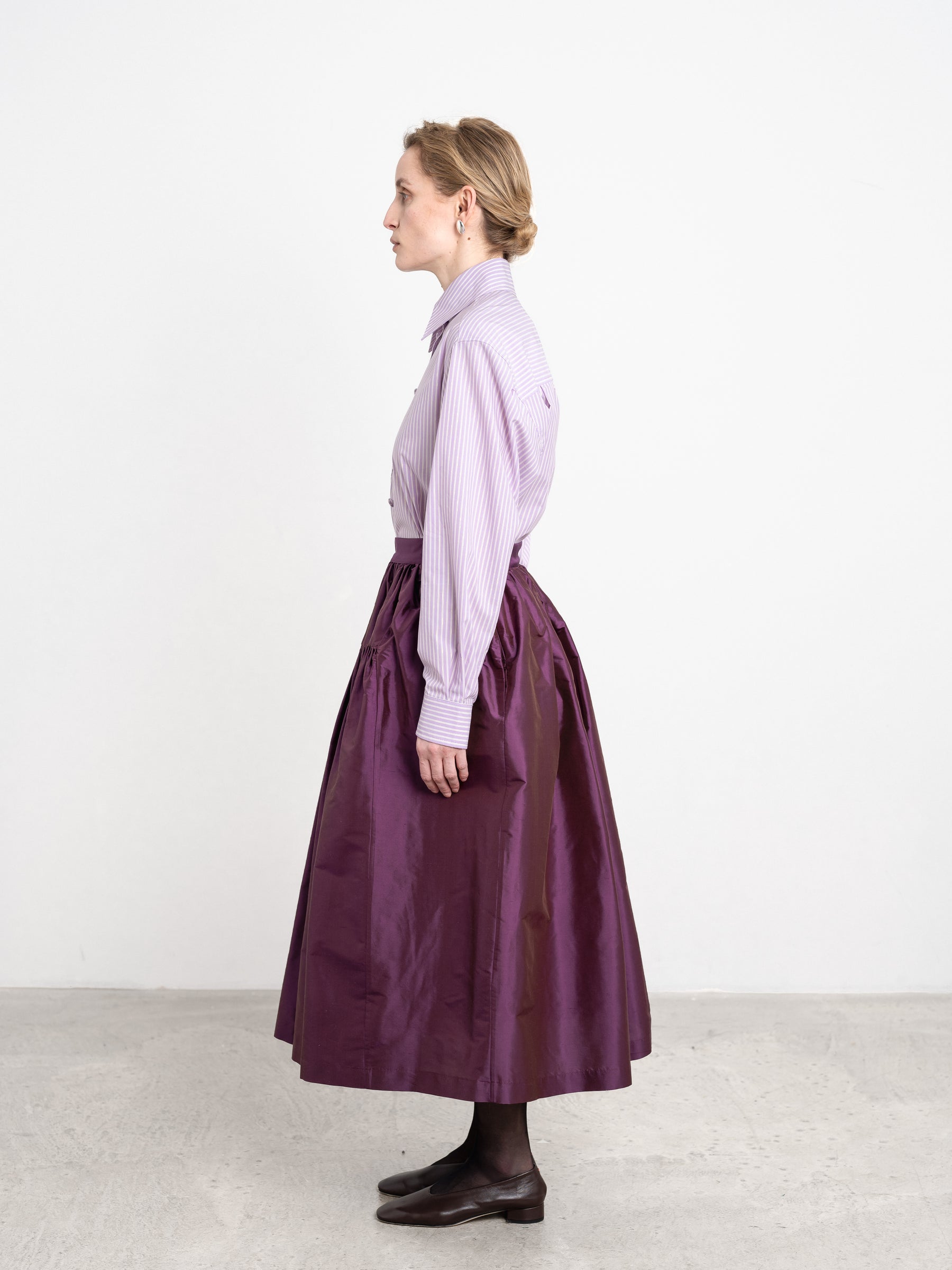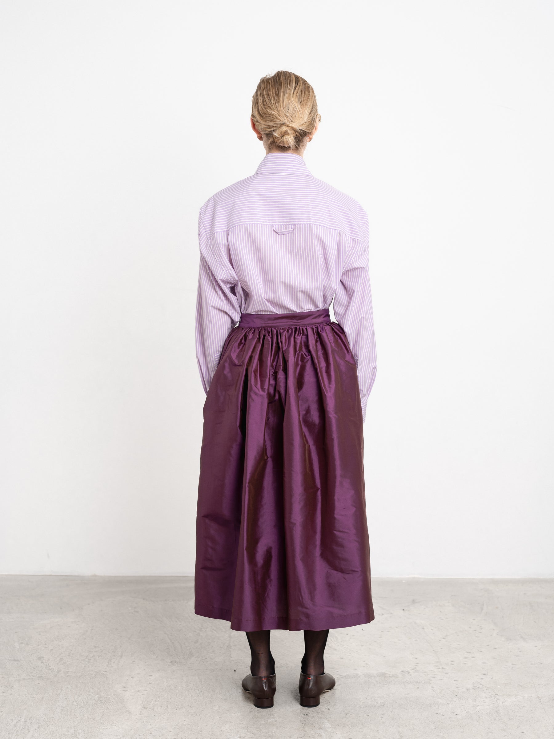 CRAFTED FROM THIS SEASONS PLUM COLOURED SILK DUPION, THE PANEL SKIRT BRINGS A TOUCH OF PLAYFUL SOPHISTICATION TO YOUR WARDROBE. THE GATHERED PANEL CONSTRUCTION CREATES A VOLUMINOUS AND FLATTERING SILHOUETTE. FINISHED WITH A DISCREET SIDE SEAM ZIP CLOSURE AND SIDE SEAM POCKETS FOR A SMOOTH, CLEAN LOOK.