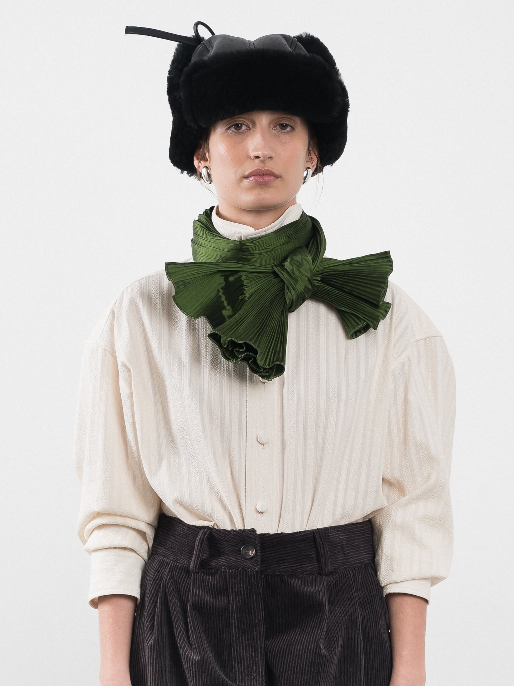 CRAFTED FROM 100% SILK DUPION AND ACCORDION PLEATED CAN BE WORN AND TIED IN A MULTITUDE OF WAYS. WEAR IT LOOSELY AROUND THE NECK, OR MANIPULATE THE SHAPE AND TIE IT AROUND THE WAIST TO SHOW OFF THE FLEXIBLE PLEATS.