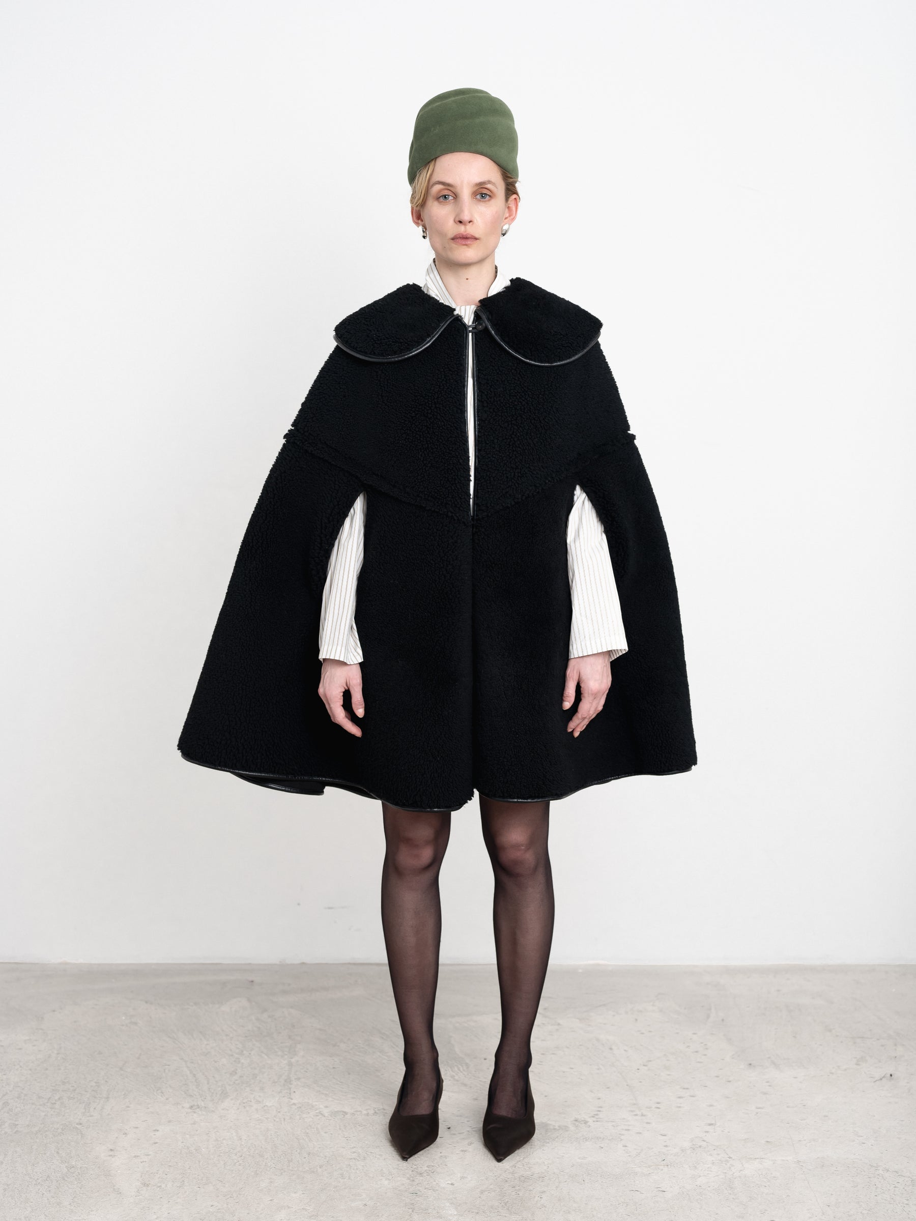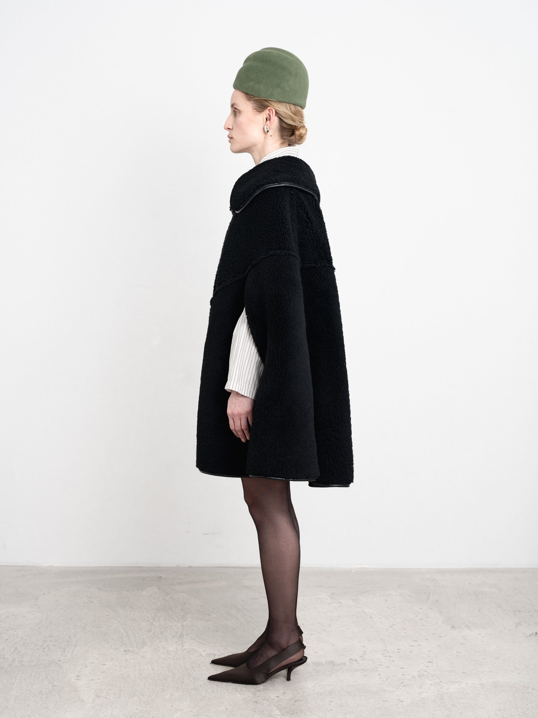 NEW FOR THE SEASON, THE CAPE IS EFFORTLESS TO STYLE AND IS CRAFTED FROM SUEDE BACK CURLY SHEEPSKIN. BUTTERY SOFT SUEDE ON ONE SIDE AND COSY SHEARLING ON THE OTHER. FEATURING A ROUNDED COLLAR, ARM SLITS DISGUISED AS WELT POCKETS AND AN A-LINE SHAPE TO CREATE A SILHOUETTE THAT IS PERFECT FOR LAYERING. WEAR THIS STATEMENT PIECE FOR BOTH STYLE AND FUNCTION.