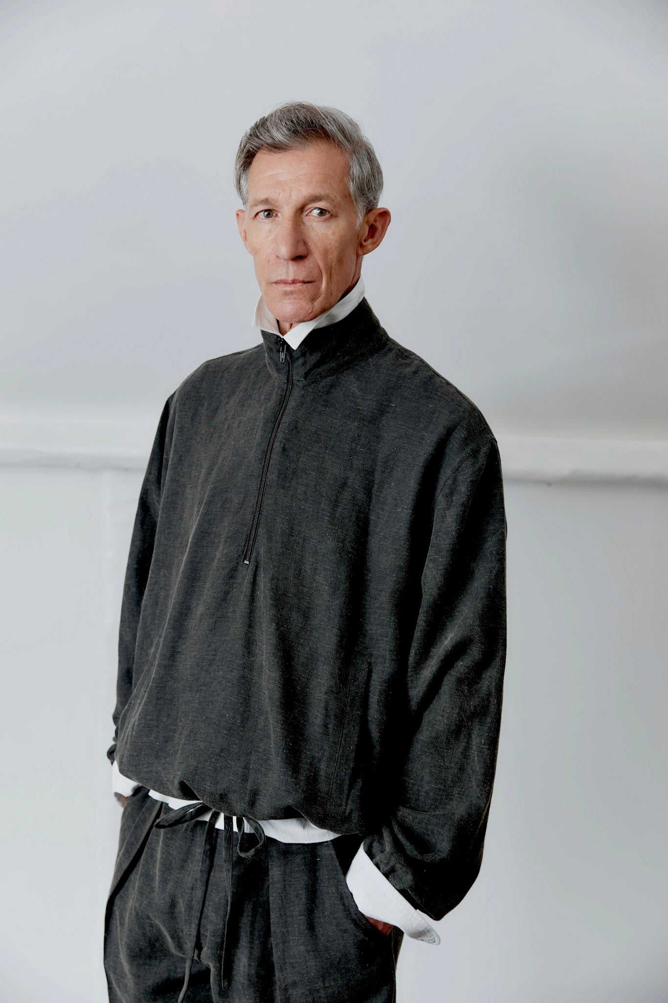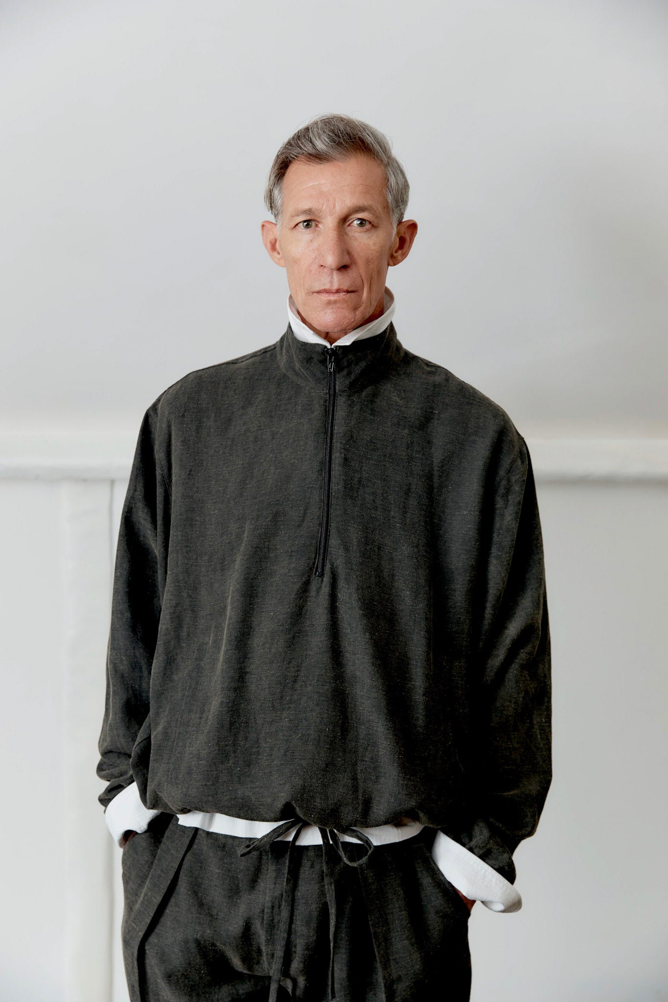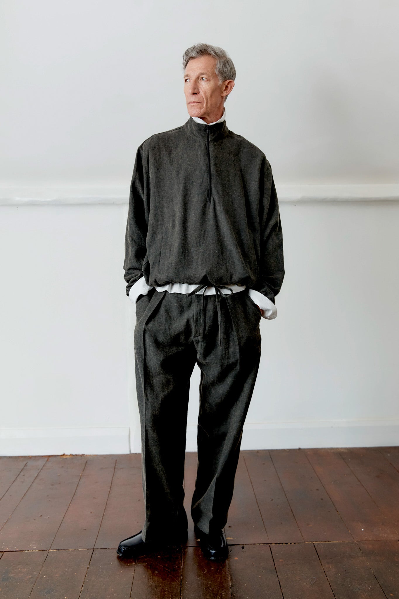 A RELAXED AND LOOSE FITTING PULLOVER CUT FROM A JAPANESE COTTON/LINEN BLEND THAT BOASTS A DRY AND WASHED COLOUR FINISH. FEATURES A HIGH STAND COLLAR WITH QUARTER LENGTH ZIPPER AND A CLEAN FINISHED REAR YOKE WITH CENTRAL HANGING LOOP. THE SLIGHTLY SHORTENED CUT AND WIDE STANDING SILHOUETTE SITS AWAY FROM THE BODY, BUT CAN BE DRAWN IN TO PROVIDE VOLUME AND PROTECTION USING THE SELF DRAWSTRINGS AT THE HEM. GENEROUS SLEEVES ARE FINISHED WITH AN ELASTICATED CUFF AND SIDE WELTS INTO A KANGAROO POCKET.