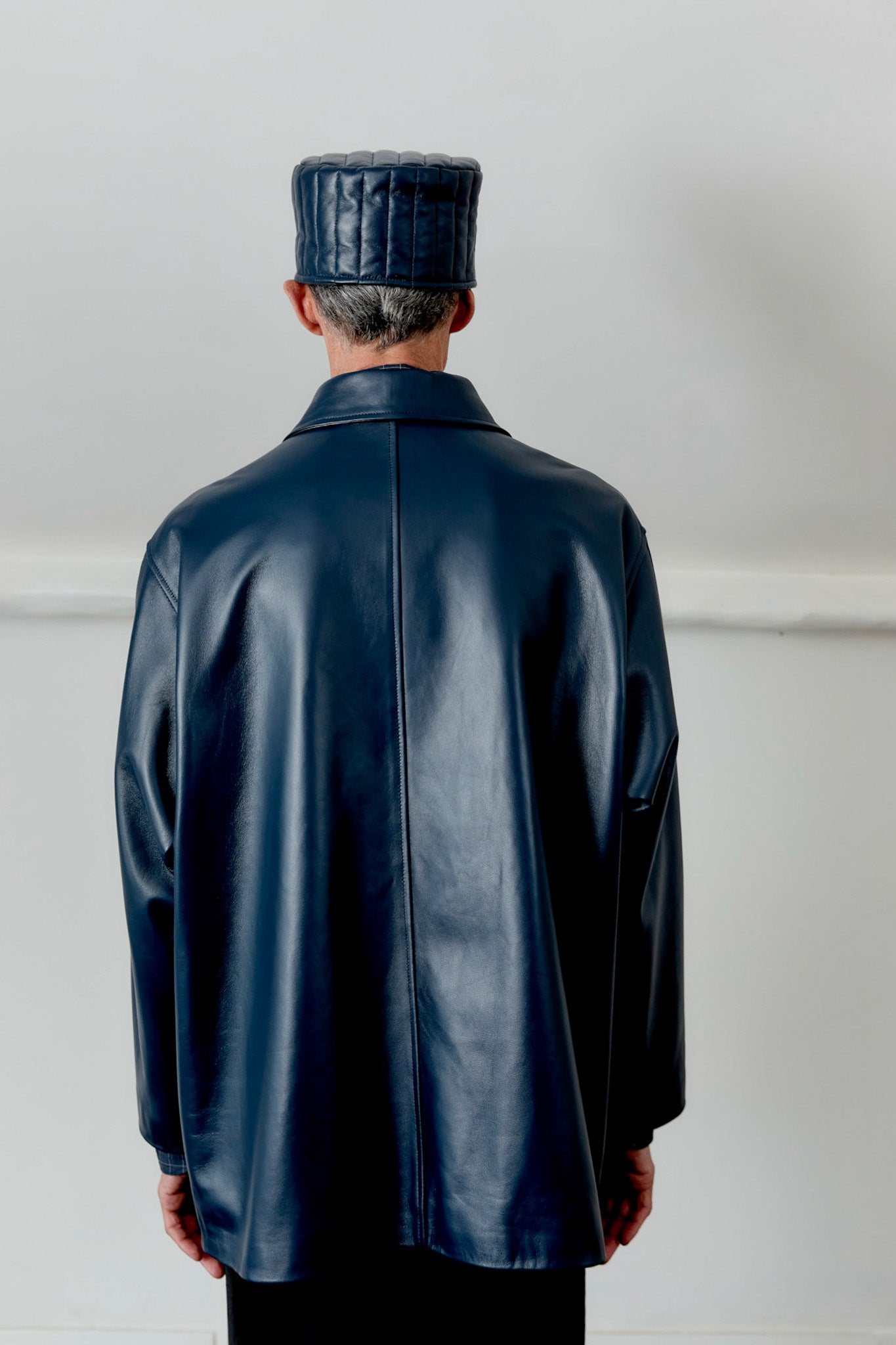 THIS MUST-HAVE JACKET IS A NECESSITY FOR ANY WARDROBE. HAND CUT AND SEWN FROM BUTTERY SOFT LEATHER IN A DEEP NAVY, THE JACKET FEATURES A ROUNDED COLLAR AND A SMOOTH VISCOSE LINING. THE OVERSIZED FIT ALLOWS YOU TO LAYER FOR THE BREEZY SUMMER EVENINGS. FINISHED WITH A HORN BUTTON FRONT CLOSURE AND TWO FRONT PATCH POCKETS.