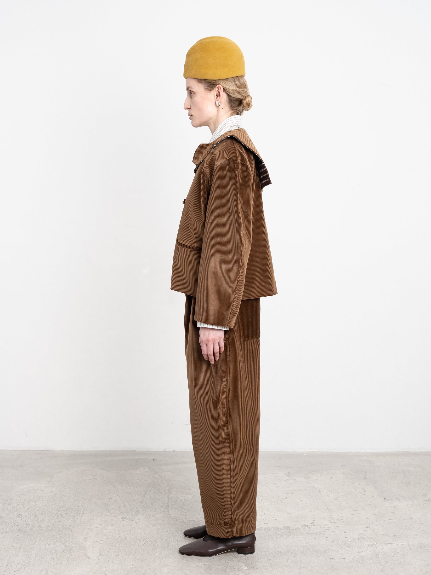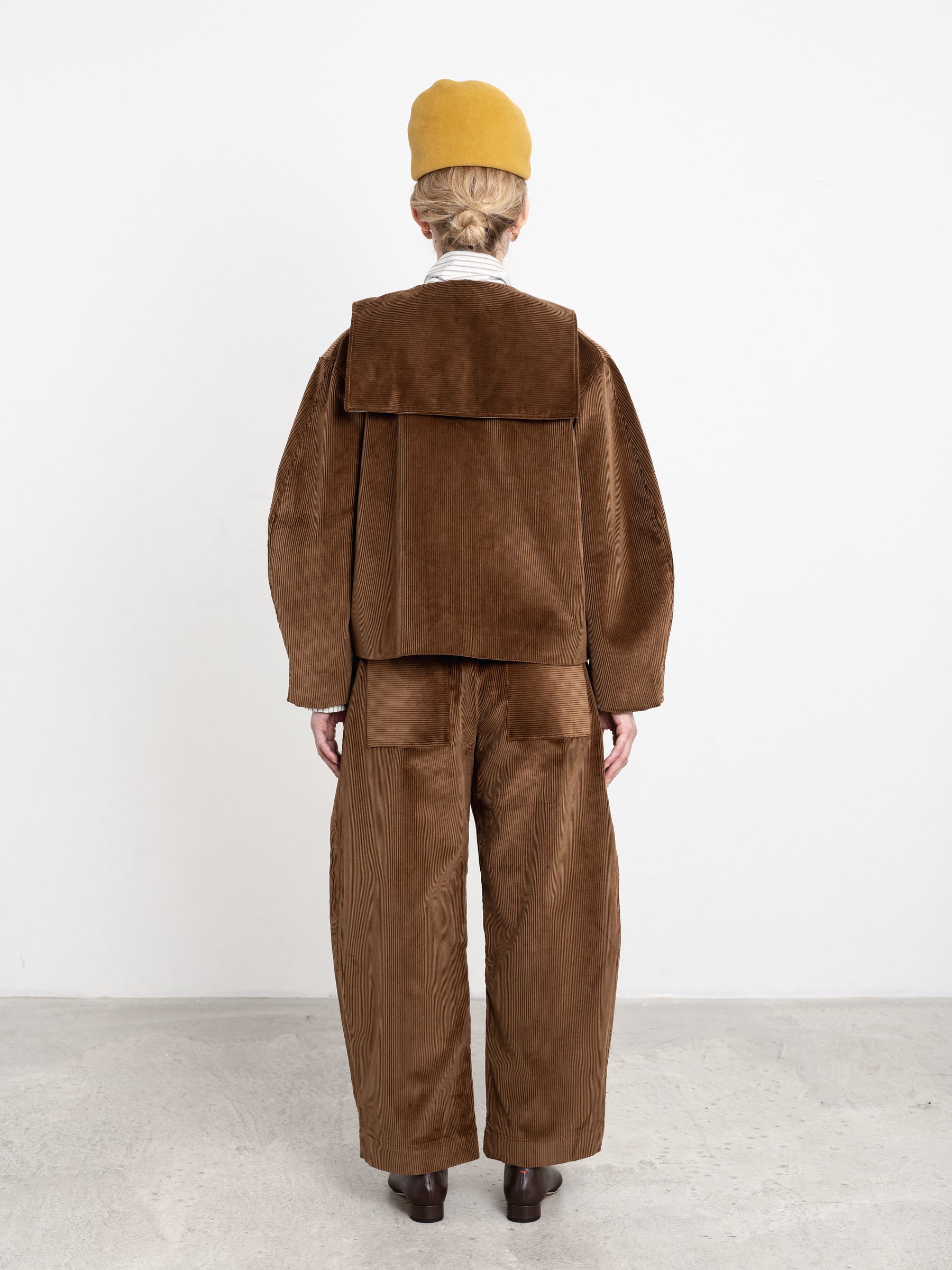 FOR AW25 THE ELLIE JACKET IS MADE FROM A SOFT TO THE TOUCH DEEP TAN CORDUROY TO KEEP YOU WARM IN THE WINTER MONTHS. FEATURING A CHARMING SAILOR-STYLE COLLAR, AND UNIQUE BUTTON TAB CLOSURE THAT CAN BE BUTTONED ON THE INSIDE TO BE HIDDEN. THE JACKET IS SLIGHTLY CROPPED, WITH A ROUNDED SLEEVE SILHOUETTE AND IS FURTHER DETAILED WITH A CONTRAST STRIPE UNDER COLLAR AND FRONT JET POCKETS.