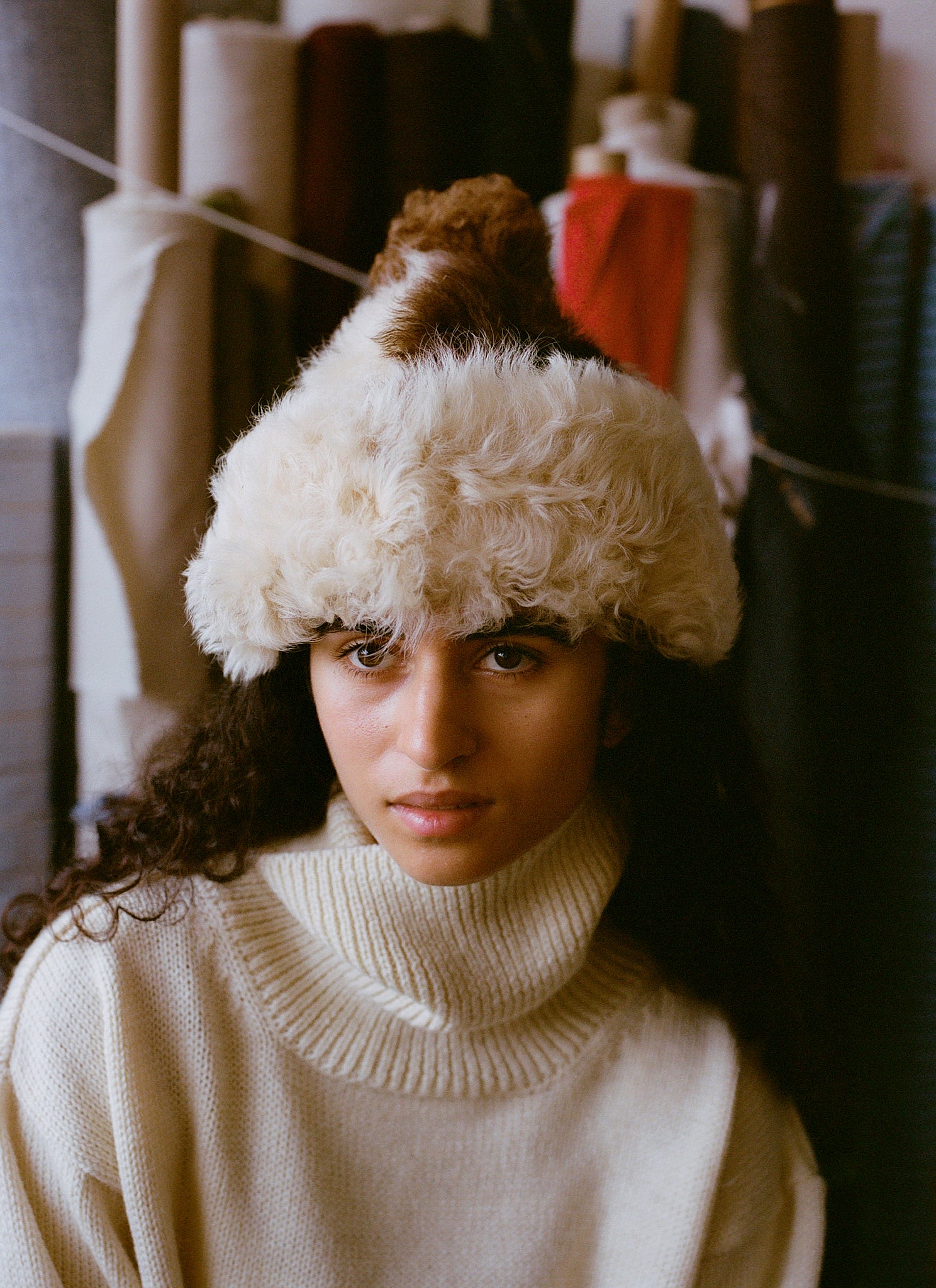 Our cow bobble hat returns for winter! made from curly shearling in cream, white and brown tones. This hat features a bobble on the top of the hat.