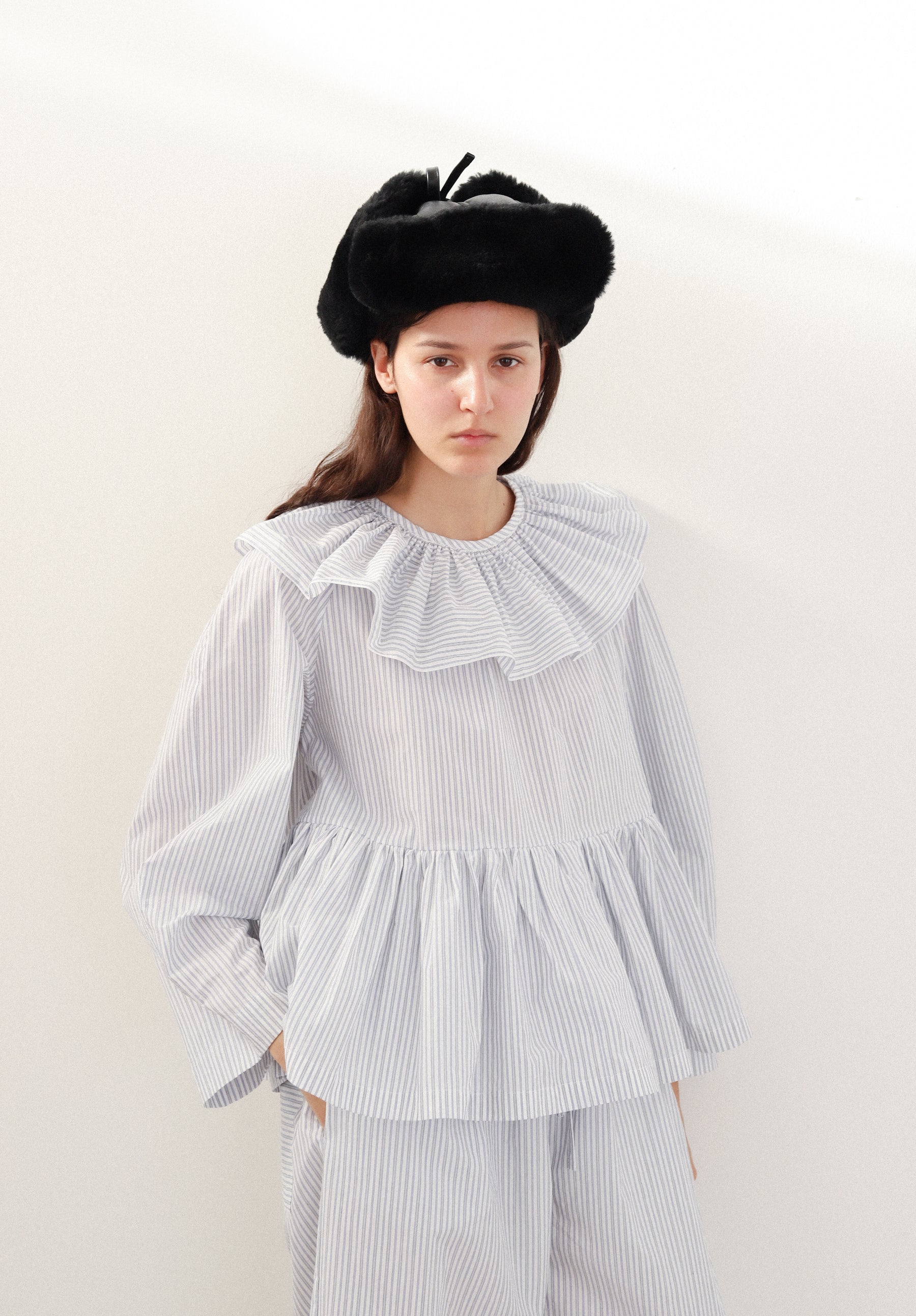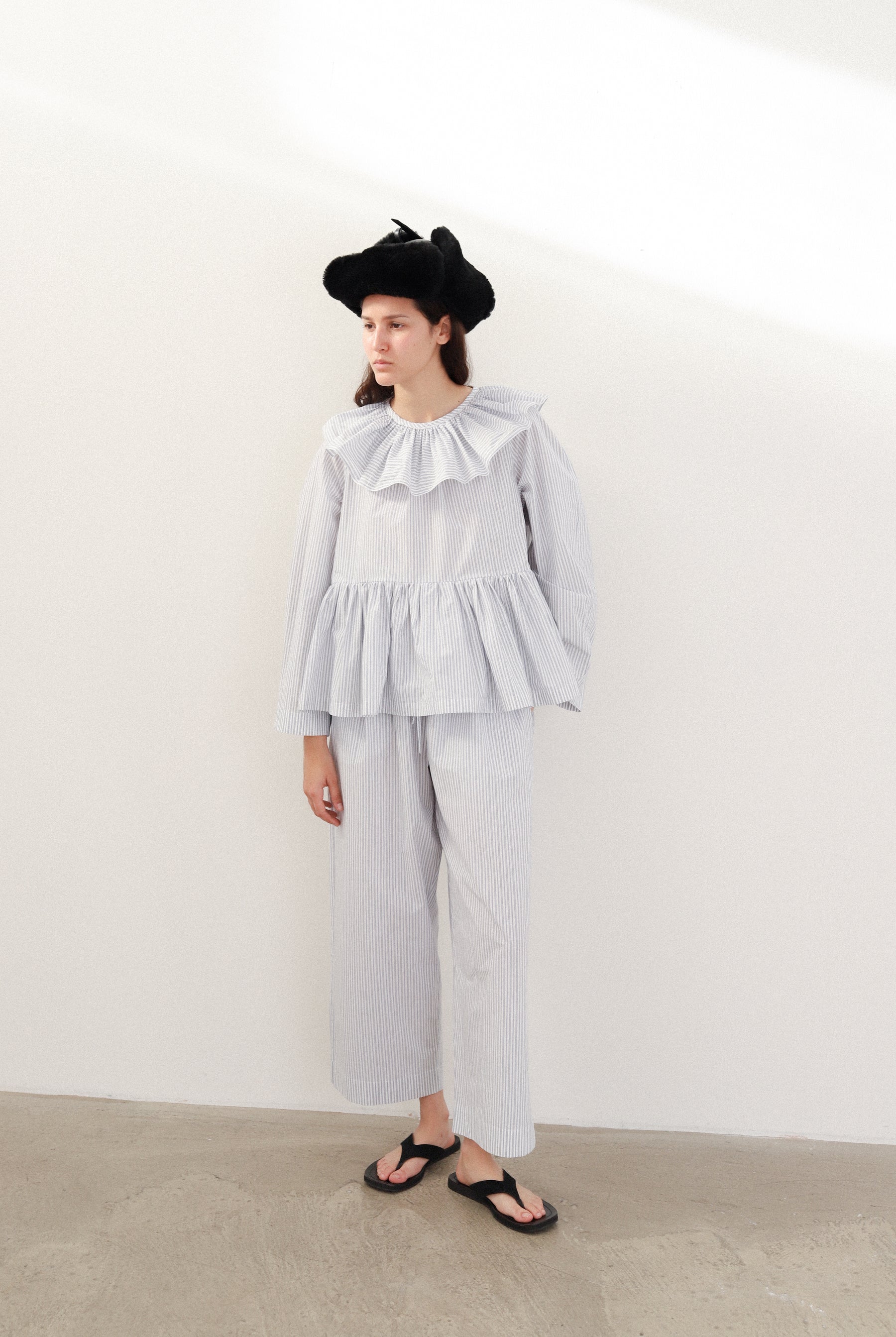 We are so excited to launch our pyjama sets - just in time for cosy wintery nights. THE RUFFLE-COLLAR PYJAMA SET FEATURES A SOFT FRILL NECKLINE AND A RELAXED, EASY SILHOUETTE. CUT FROM LIGHTWEIGHT FABRIC, IT’S DESIGNED TO BE WORN BOTH AT HOME AND OUT.