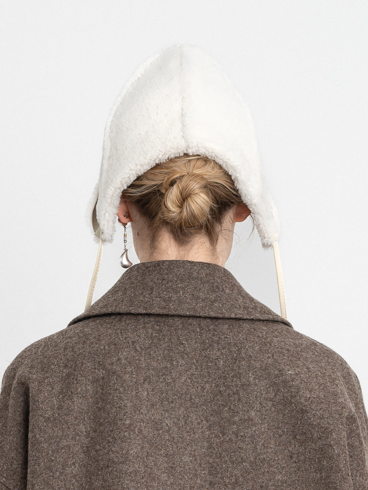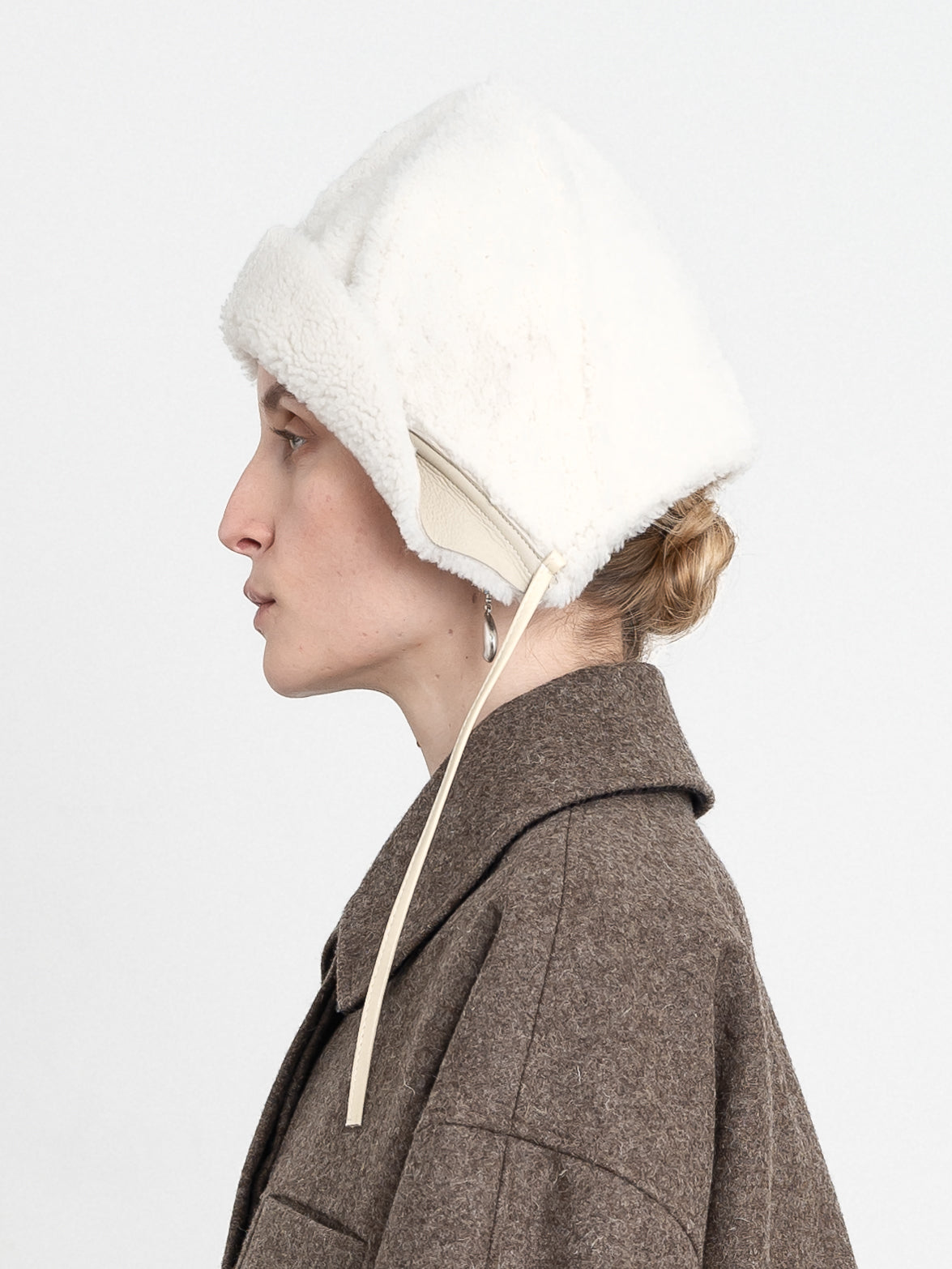 CUT FROM CHALK COLOURED LEATHER BACK CURLY SHEEPSKIN, OUR BONNETS FITTED SHAPE ALLOWS YOU TO LAYER IT UNDER A HOOD FOR EXTRA WARMTH, AND IS A STAPLE PIECE TO BE WORN ALL WINTER.