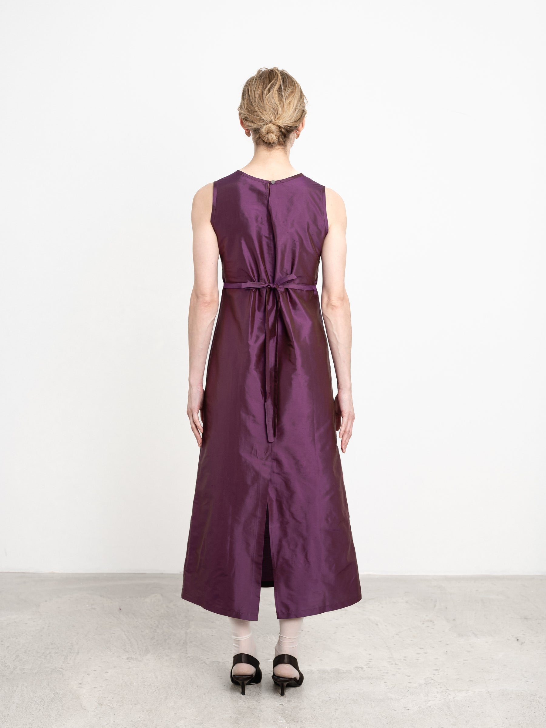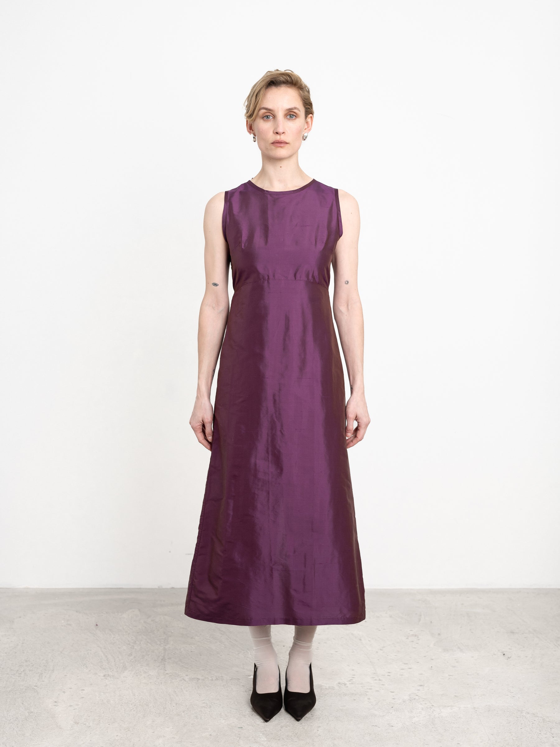 NEW FOR AW25, THE ERIKA DRESS IS MADE IN A DEEP PLUM COLOURED SILK DUPION, PERFECT FOR A SPECIAL OCCASION OR DAILY LAYERING. WITH A SLEEK AND SIMPLE SILHOUETTE, THE DRESS FEATURES A TIE TO CINCH IN THE WAIST, A BACK HEM SLIT AND A SHELL BUTTON AND KEYHOLE CLOSURE.