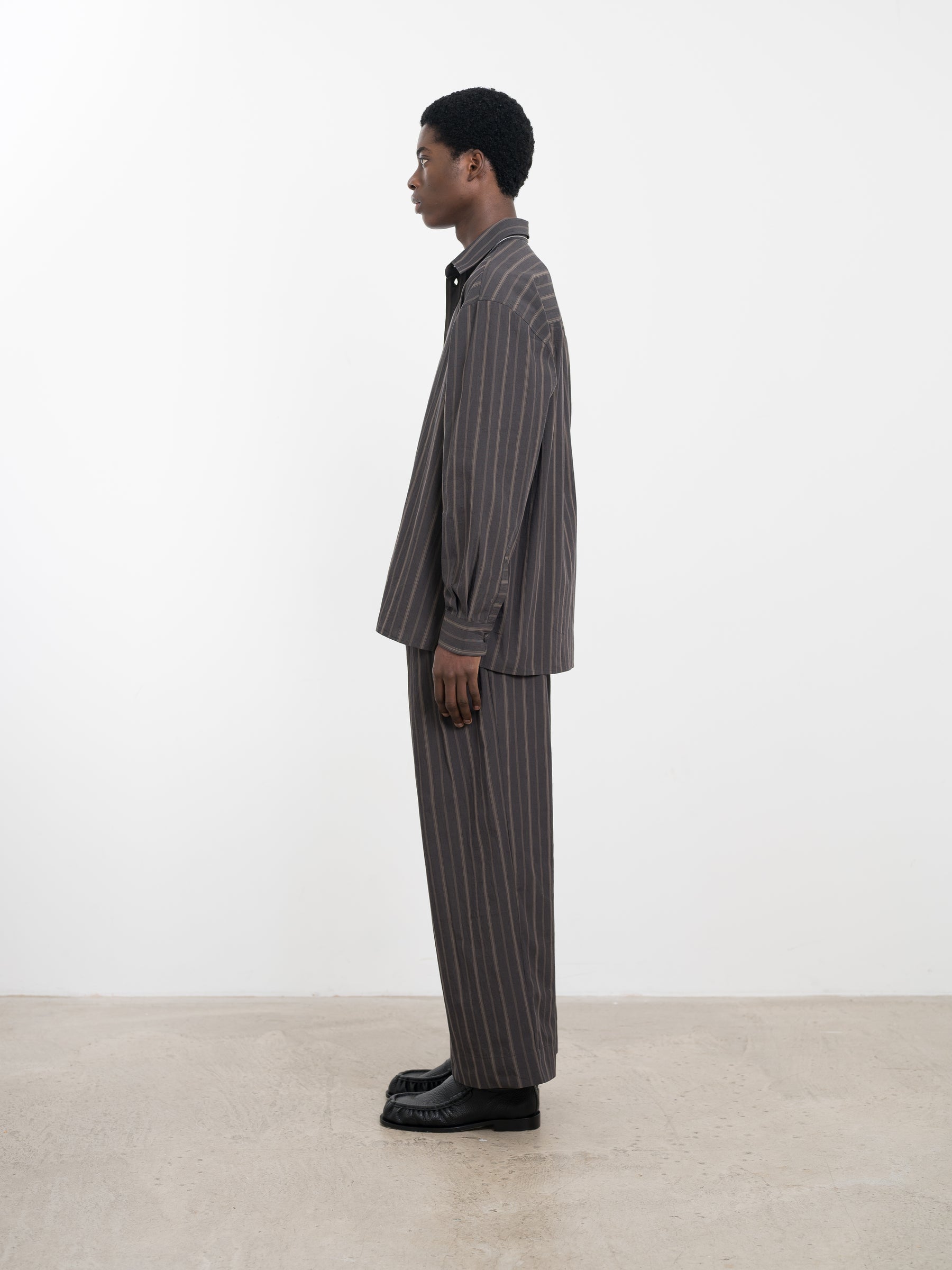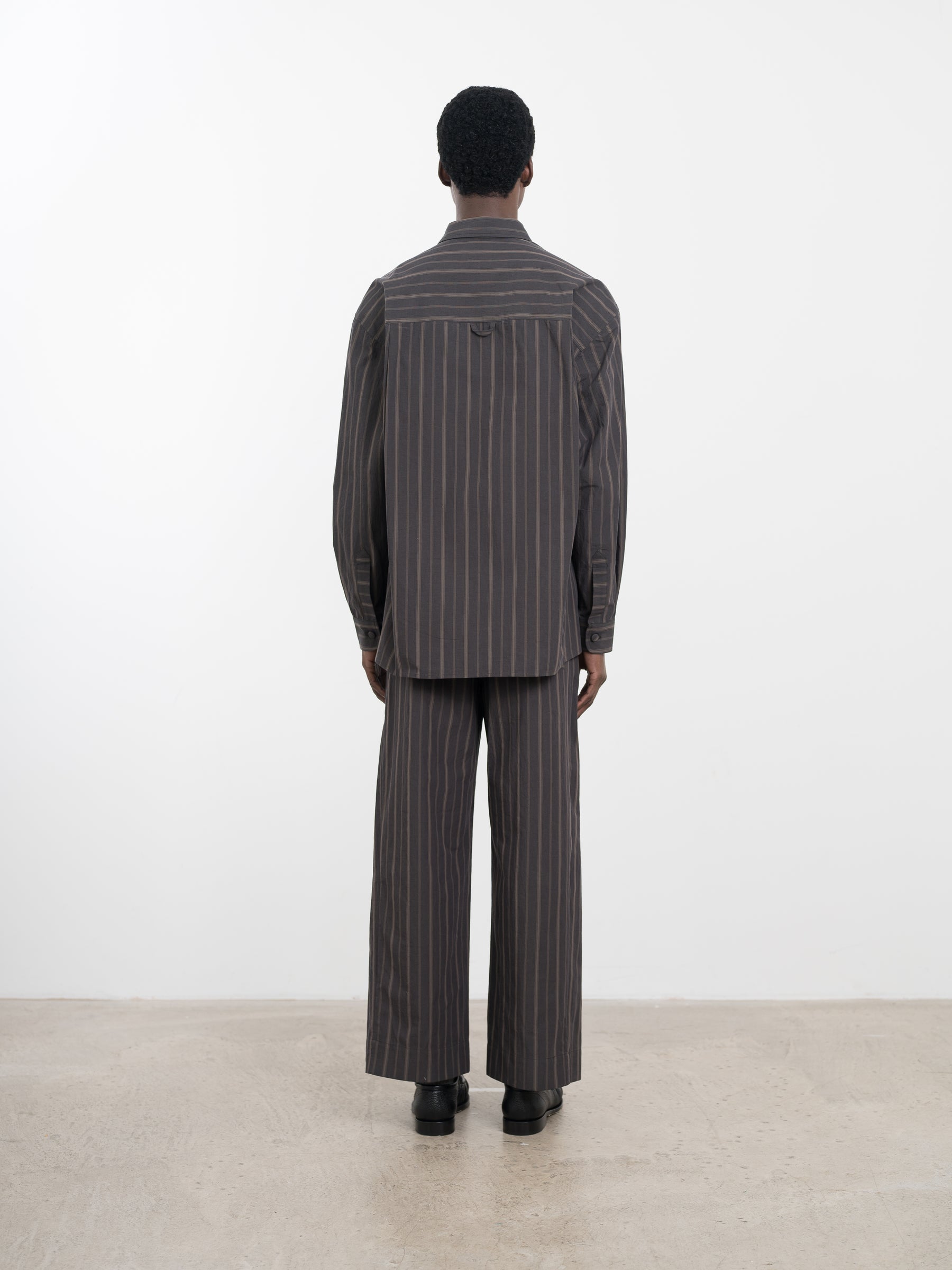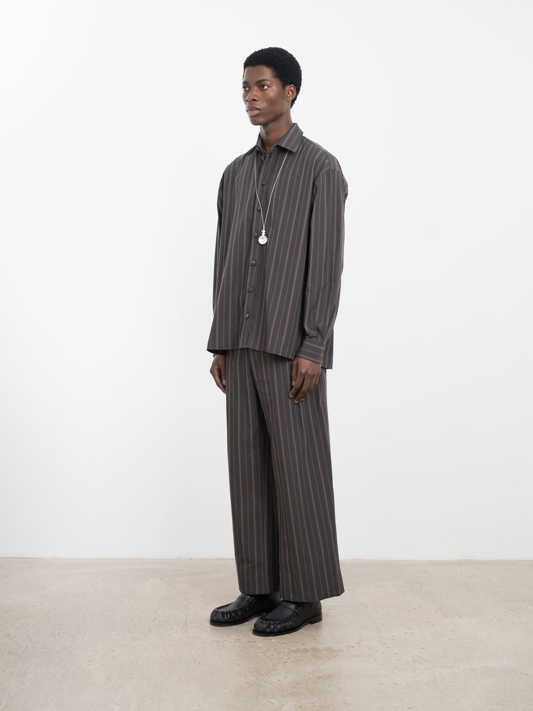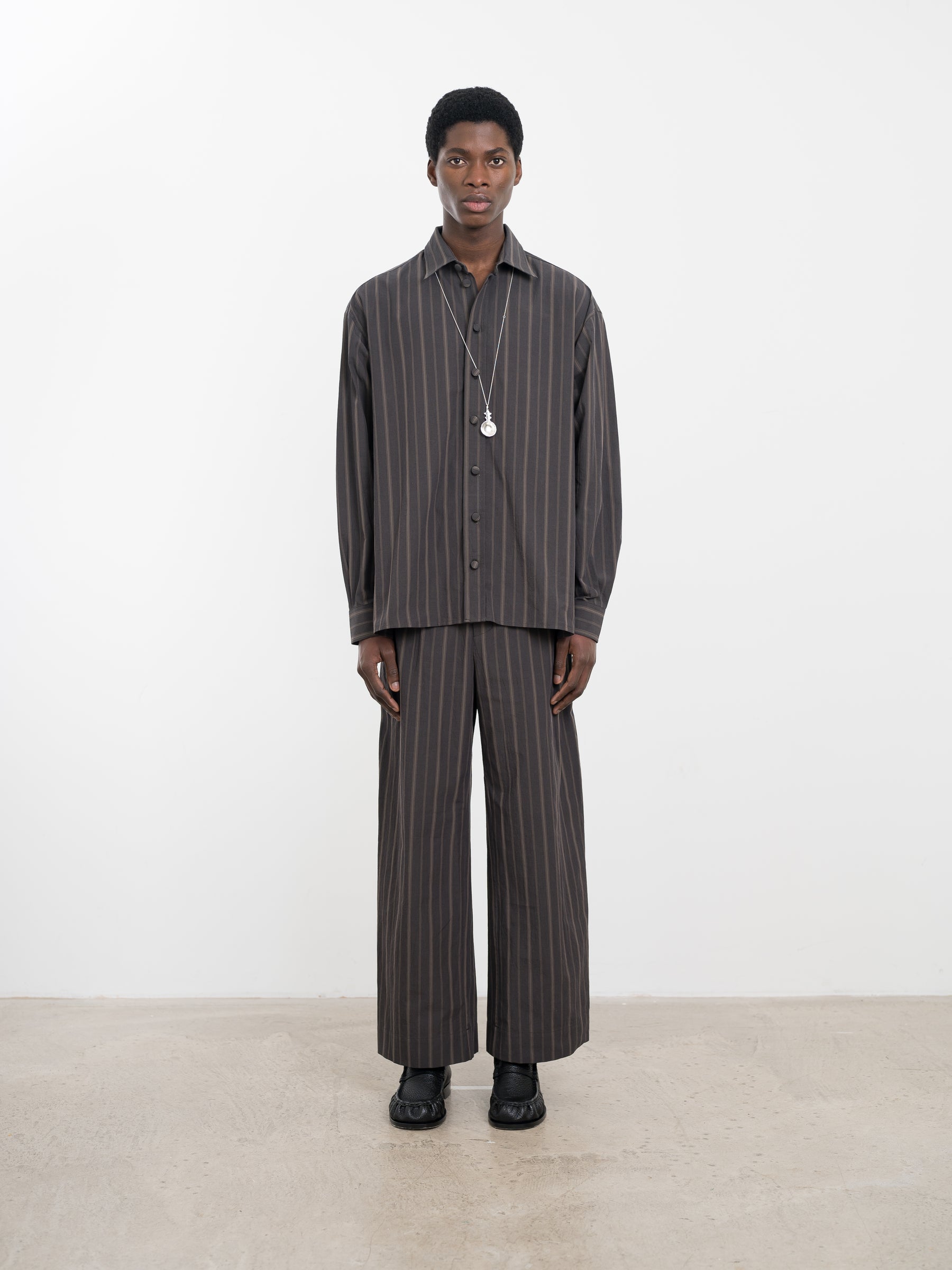THE PLAYERS SHIRT OFFERS A RELAXED, OVERSIZED FIT WITH A CLASSIC BUTTON-DOWN DESIGN. ITS DARK GREY STRIPED JAPANESE MUGWASHER COTTON ADDS A SUBTLE PRINT FOR VERSATILE STYLING. COMPLETE WITH A POINTED COLLAR, BUTTON-DOWN PLACKET WITH MATCHING COVERED BUTTONS, AND A STRAIGHT HEM. THIS SHIRT EFFORTLESSLY COMBINES COMFORT AND STYLE.