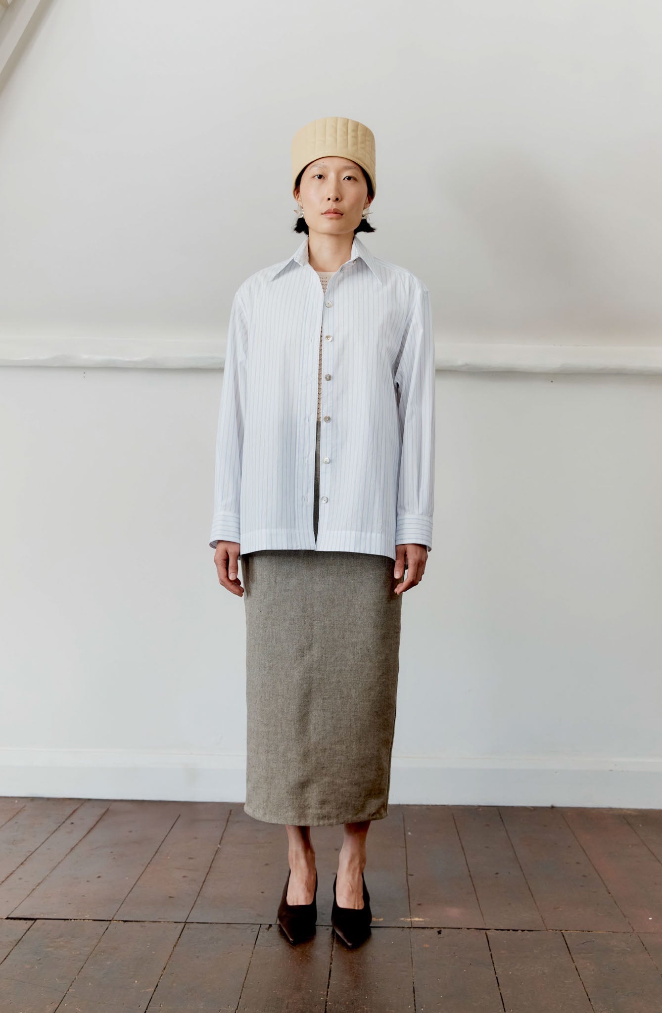 THE PERFECT CLASSIC BUTTON-UP SHIRT WITH A ROOMY AND RELAXED FIT. CUT FROM A CLASSIC JAPANESE ORGANIC STRIPED COTTON, OUR JUNE SHIRT FEATURES A POINTED COLLAR, MATCHING COVERED BUTTONS AND A BACK YOKE HANGING LOOP.