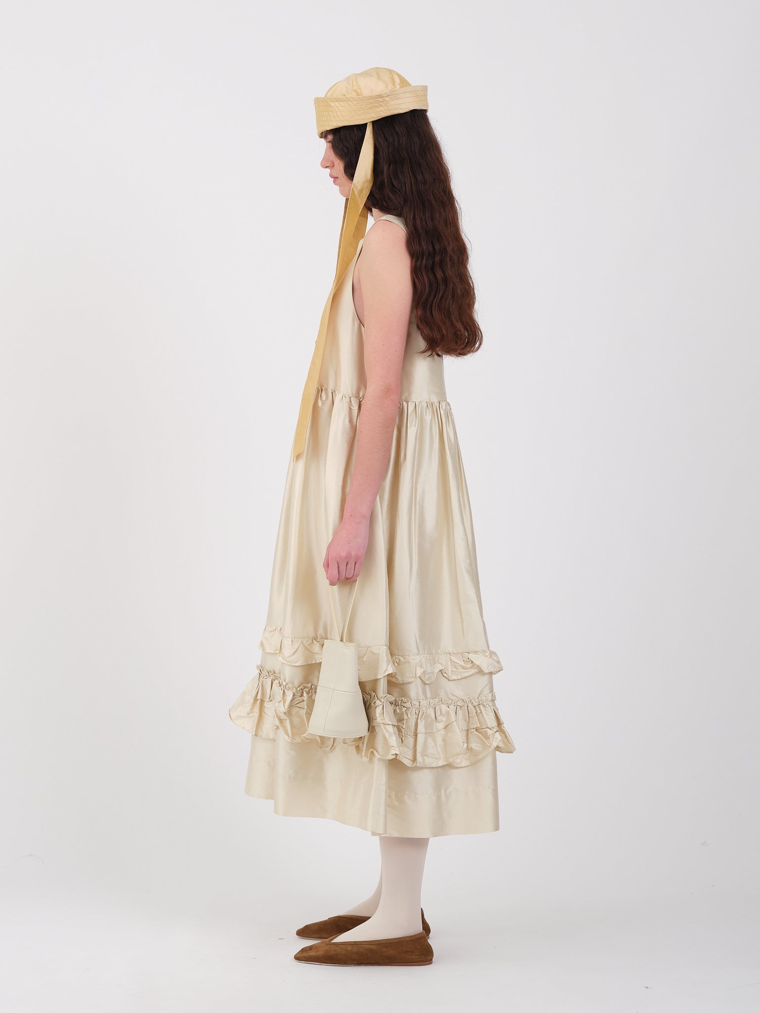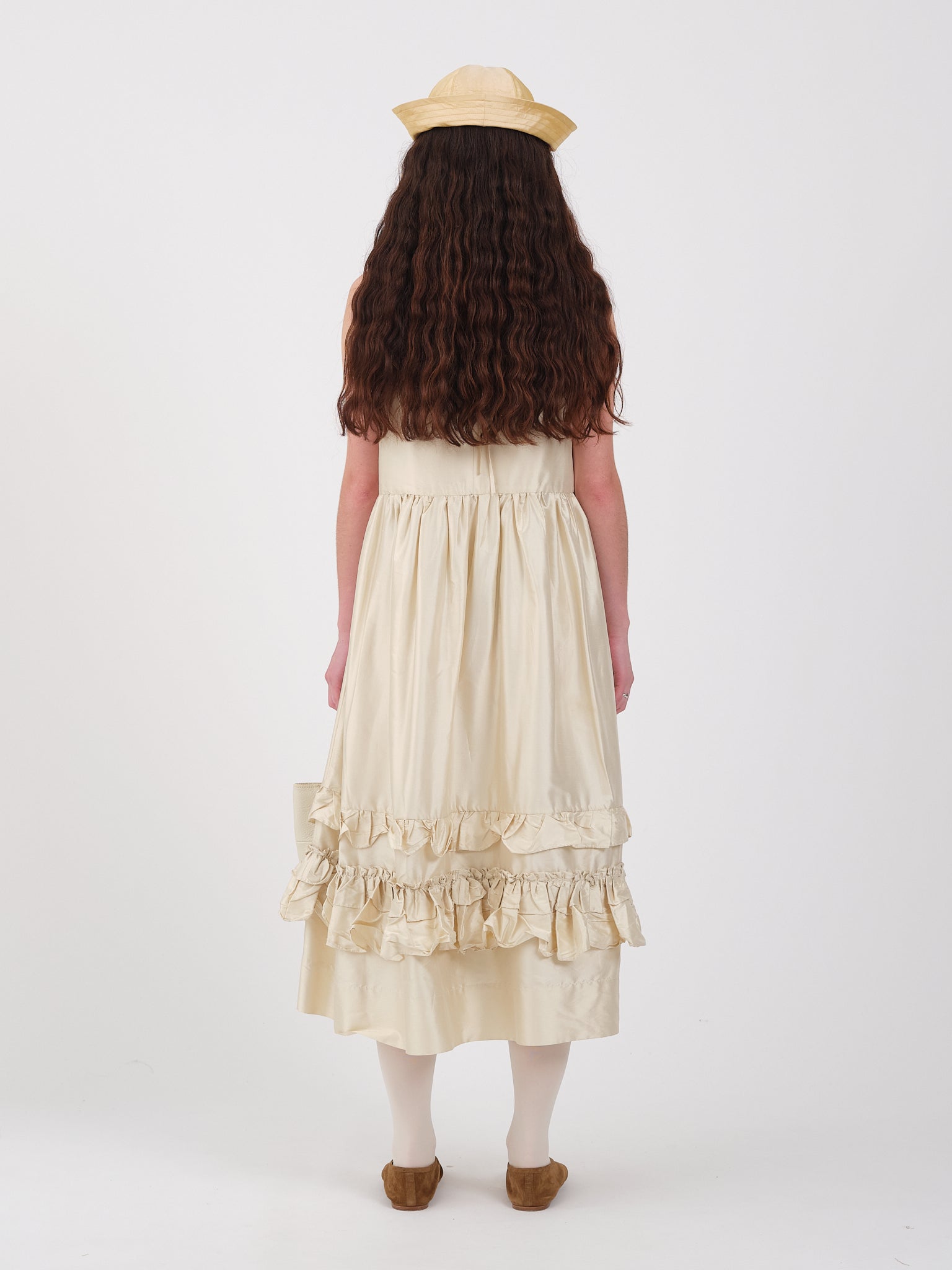 OUR CLASSIC SILK DUPION GENEVIEVE DRESS IS AN OVER-THE-HEAD STYLE WITH A KEYHOLE OPENING AND SELF-TIE CLOSURE. FEATURING A GATHERED WAISTLINE, SIDE SEAM POCKETS, AND TIERED LAYERED OF HEM FRILLS.